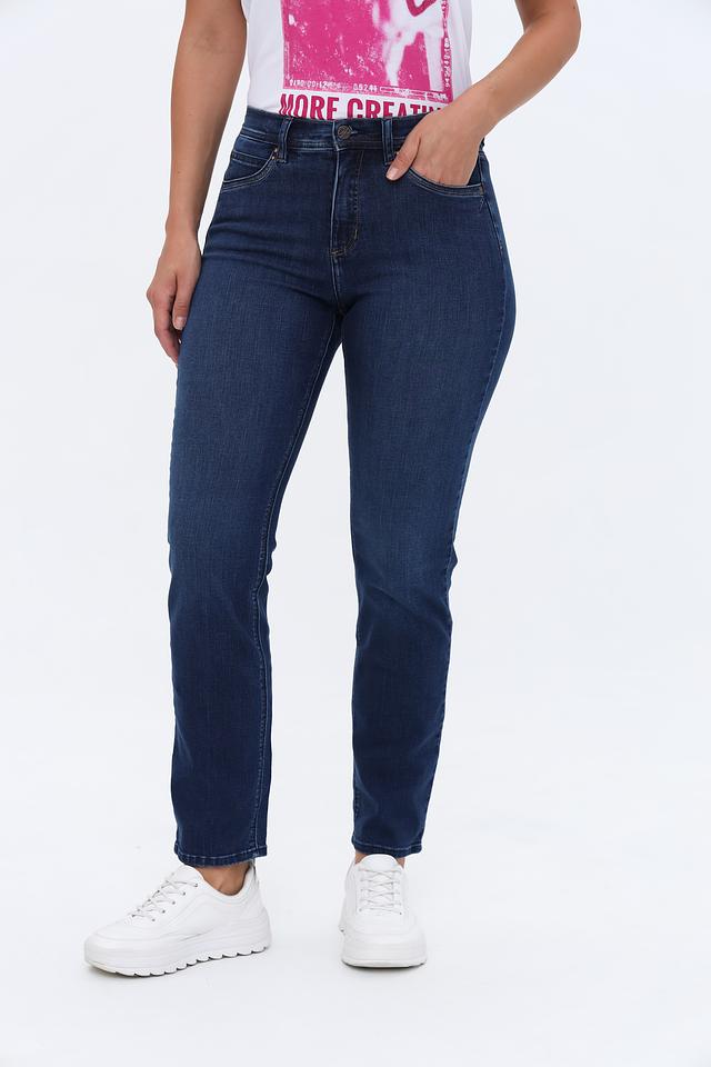 Джинсы имеют высокую посадку, подчеркивающую талию и создающую элегантный силуэт. Прямой крой обеспечивает комфортную посадку и свободу движений. Ткань состоит из хлопка (95%), полиэстера (3%) и эластана (2%), что обеспечивает мягкость, прочность и небольшую эластичность.