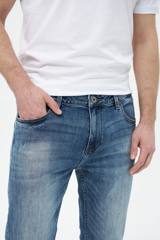 Представляем вашему вниманию мужские джинсы от бренда Pezzo. Модель выполнена в классическом синем цвете с выраженным эффектом потертости и легким выцветанием, что придает им современный и непринужденный вид.