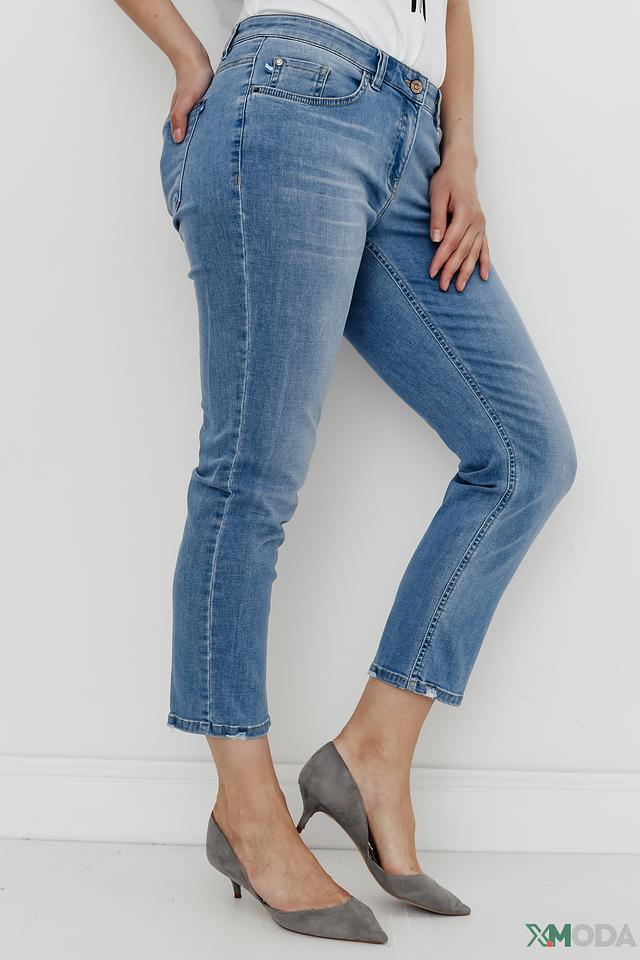 Джинсы имеют прямой крой и укороченную длину, что придает им современный и модный вид. Эффект потертостей добавляет образу непринужденности и индивидуальности. Застежка на молнию и пуговицу обеспечивает надежную фиксацию. Пять карманов – два спереди, два сзади и один небольшой карман для мелочи.