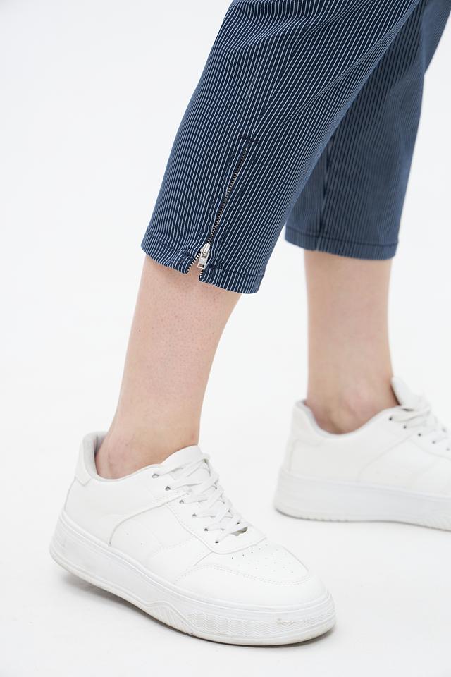 Джинсы имеют укороченный крой и классическую посадку по фигуре. Вертикальная полоска визуально стройнит и придает образу свежесть. Пять карманов — два спереди, два сзади и один небольшой карман для мелочи.