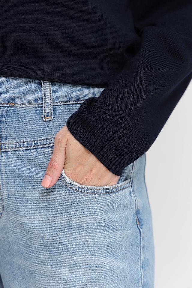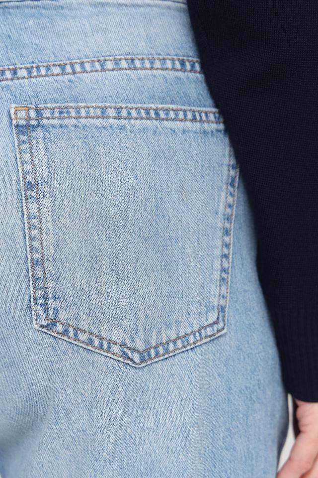 Джинсы имеют завышенную талию и свободный крой, который подчеркивает фигуру и создает непринужденный образ. Голубой цвет и легкий эффект потертости придают джинсам винтажный вид.