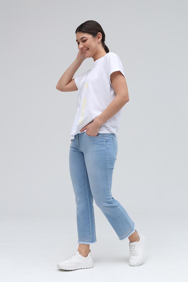 Светло-голубые джинсы Zerres с оригинальным декором из страз на штанинах. Модель выполнена в актуальном укороченном крое с необработанным краем, что придает образу непринужденность и стиль. Состав: хлопок 71%, полиэстер 16%, лиоцел 11%, эластан 2%