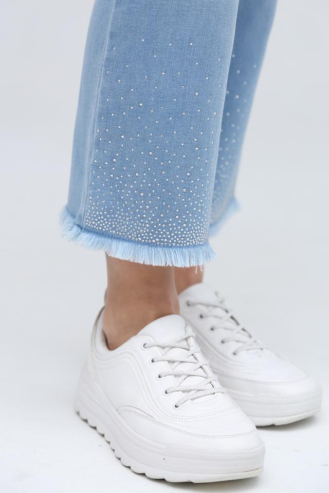 Особенностью этих джинсов является декор из страз, расположенный на штанинах. Необработанный край добавляет образу дерзости и современности. Классическая посадка и прямой крой обеспечивают комфорт и свободу движений.
