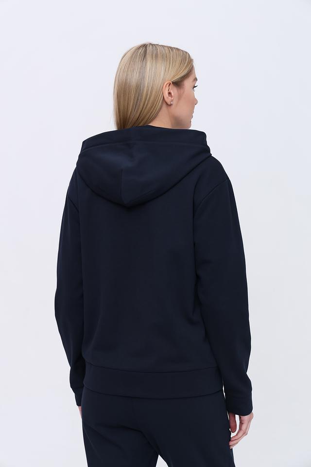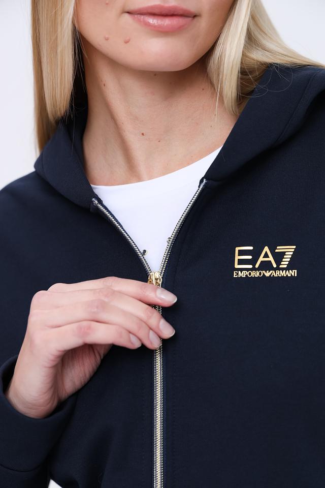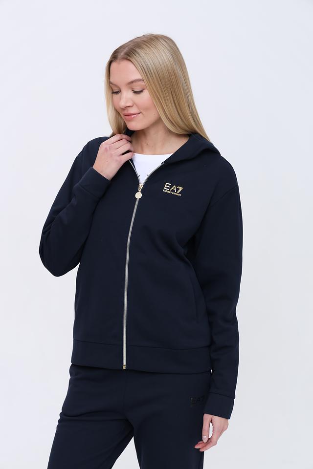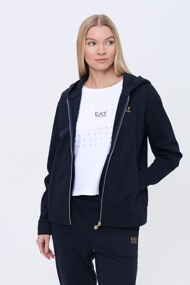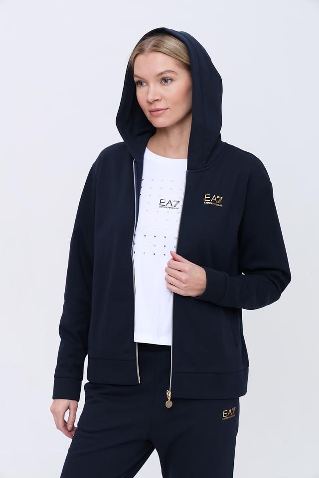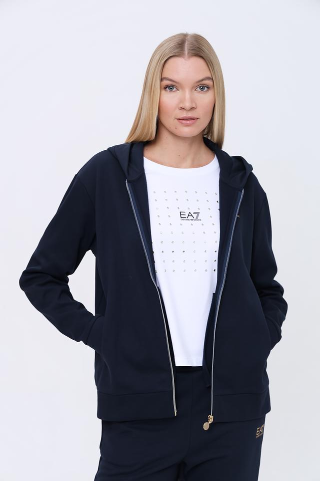 Женский спортивный костюм EA7 темно-синего цвета состоит из худи на молнии и брюк. Комплект выполнен из мягкого полиэстера с добавлением хлопка для комфорта и удобства во время тренировок и активного отдыха. Состав: полиэстер 74%, хлопок 26%