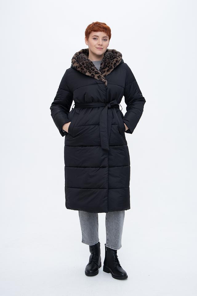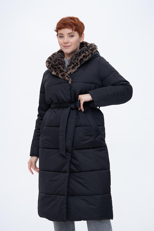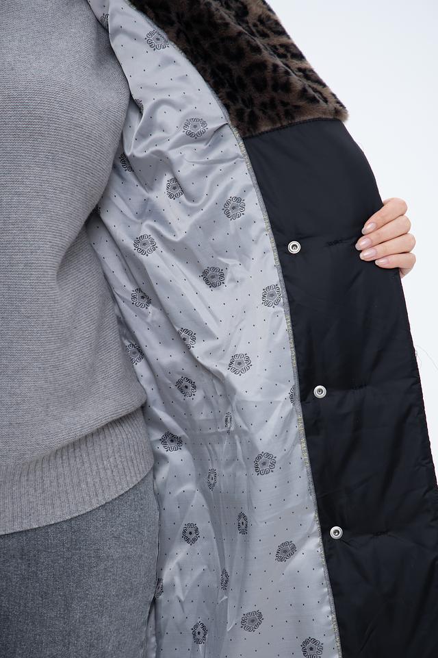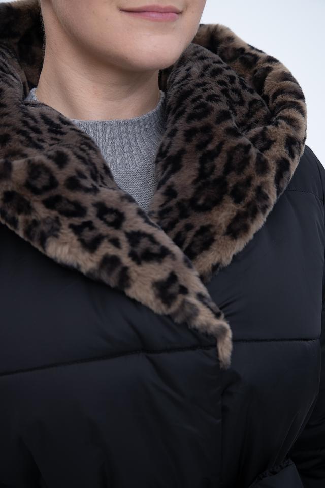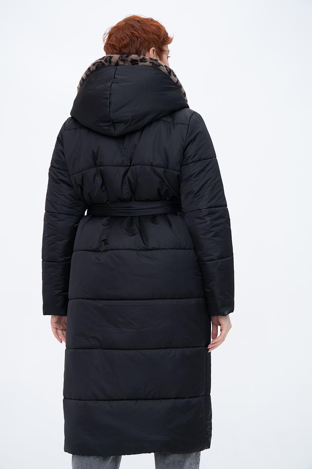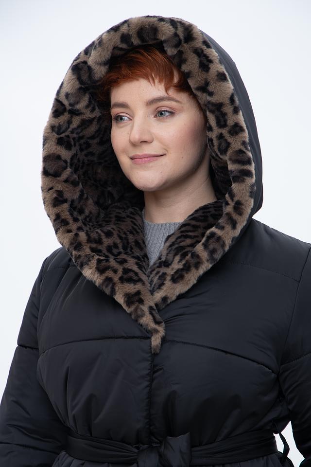 Модель имеет удлинённый силуэт и стеганую фактуру, что придает ей современный вид. Капюшон отделан мягким искусственным мехом леопардового расцветки, который добавляет образу роскоши и тепла. Пальто застегивается на молнию и имеет пояс, который позволяет подчеркнуть талию и создать более женственный силуэт.