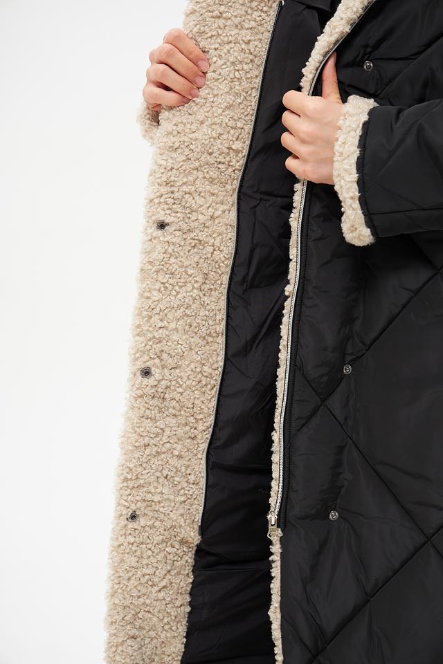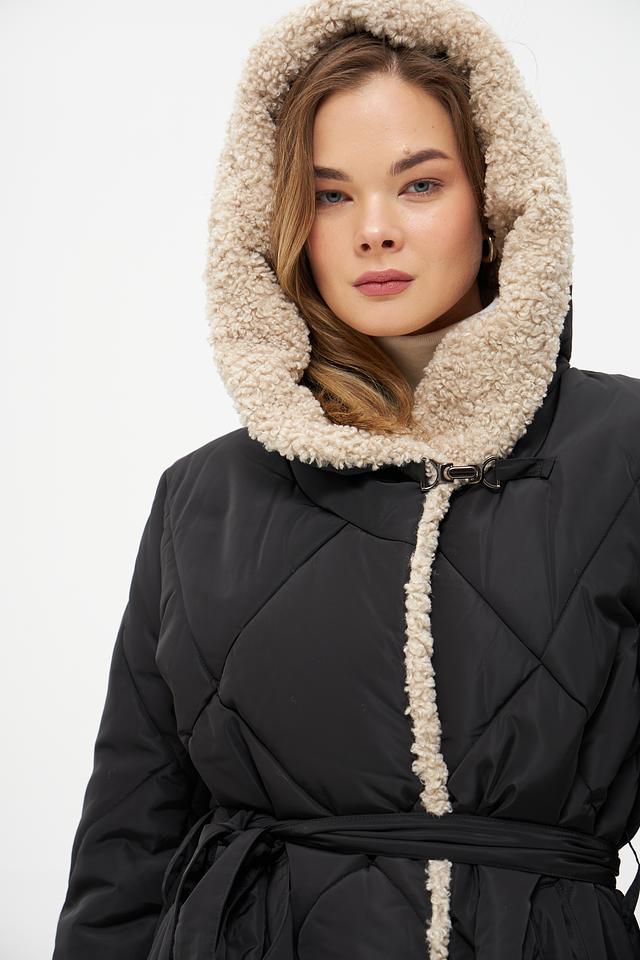 Модель оснащена удобным капюшоном и отделано искусственным мехом кремового оттенка по краю капюшона и вдоль планки застежки, что обеспечивает дополнительное тепло и комфорт. Пальто застегивается на кнопки и имеет пояс, который позволяет подчеркнуть талию и создать более женственный силуэт.