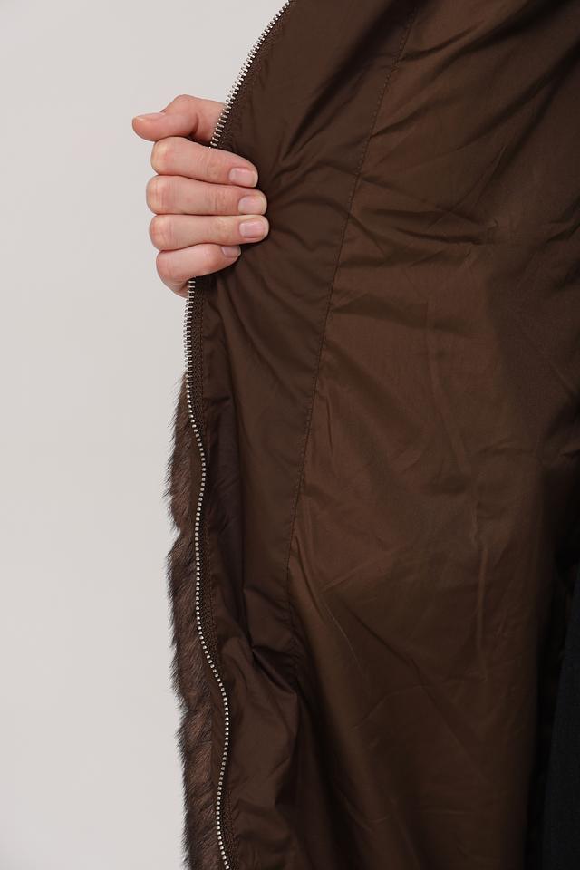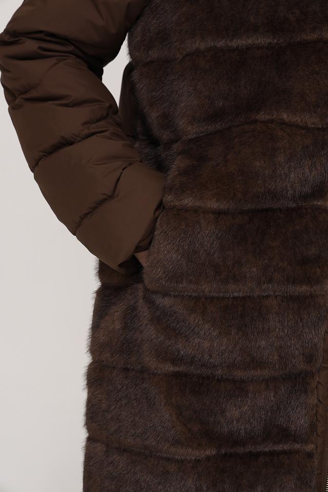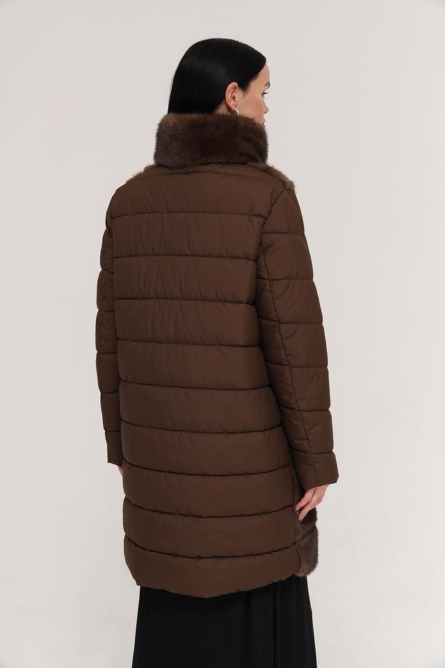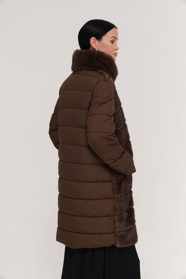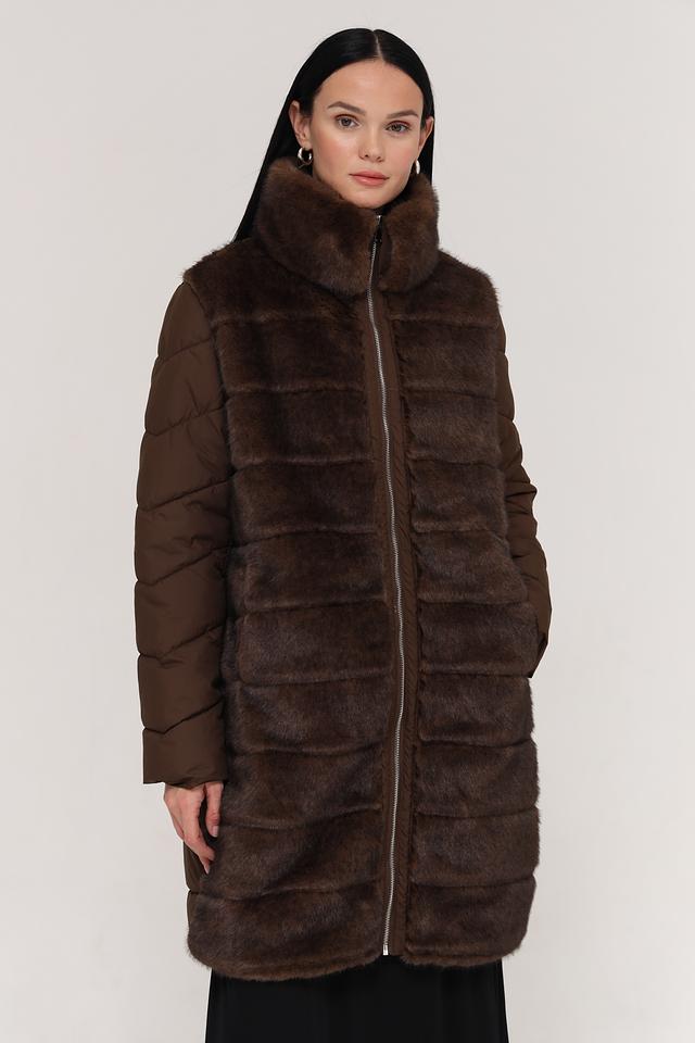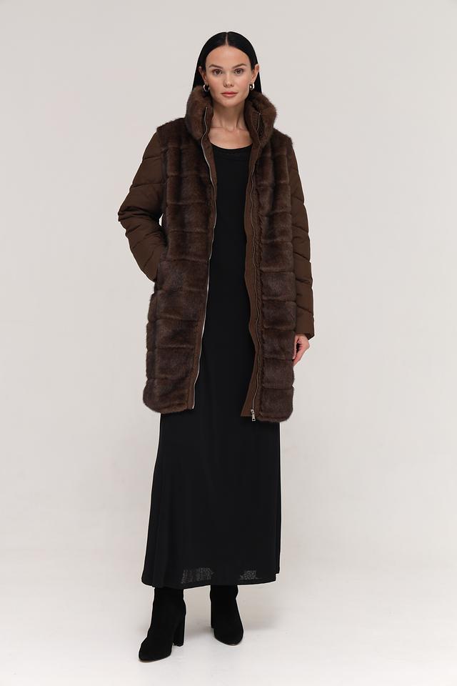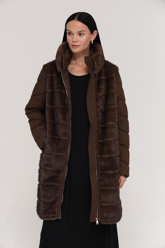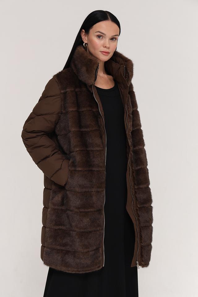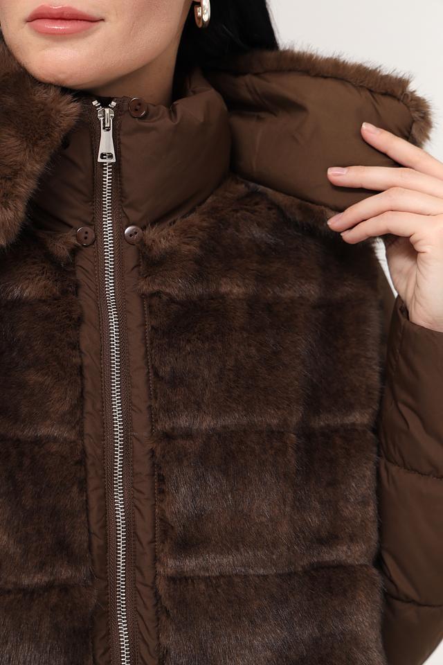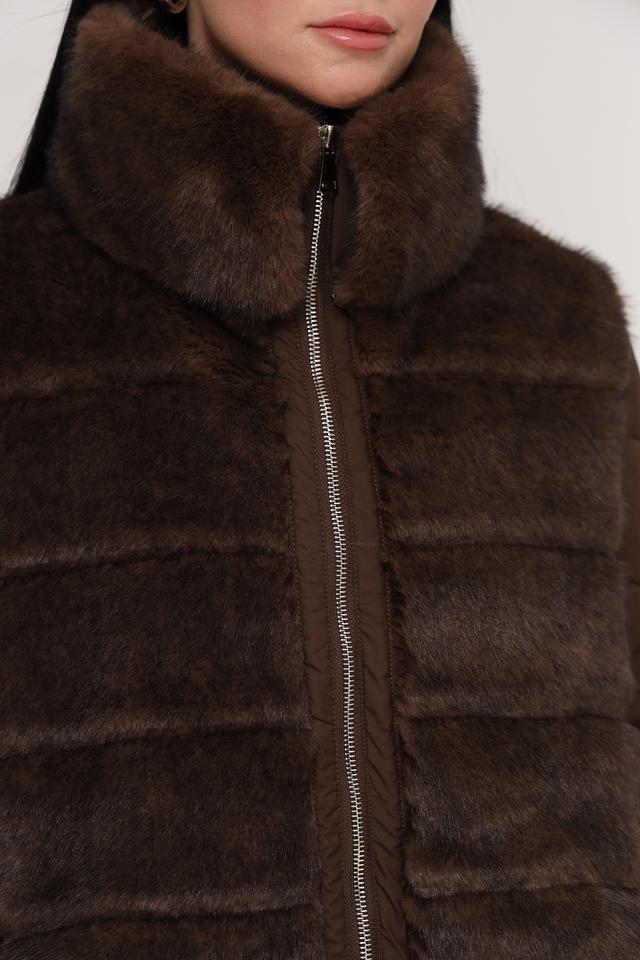 Куртка имеет комбинированную конструкцию: верхняя часть и рукава выполнены из стеганого полиэстера коричневого цвета, а нижняя часть и воротник отделаны искусственным мехом насыщенного коричневого оттенка. Застежка – молния по всей длине изделия.