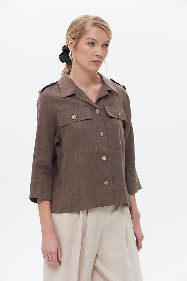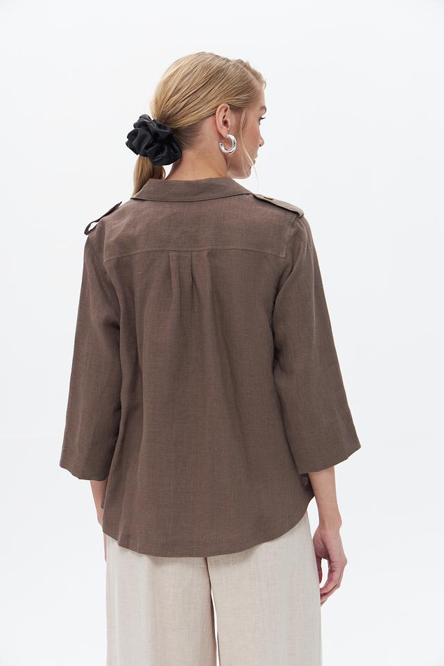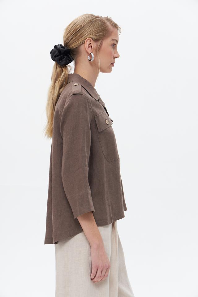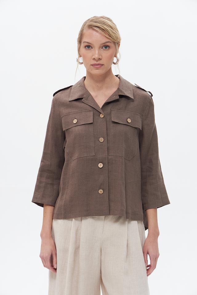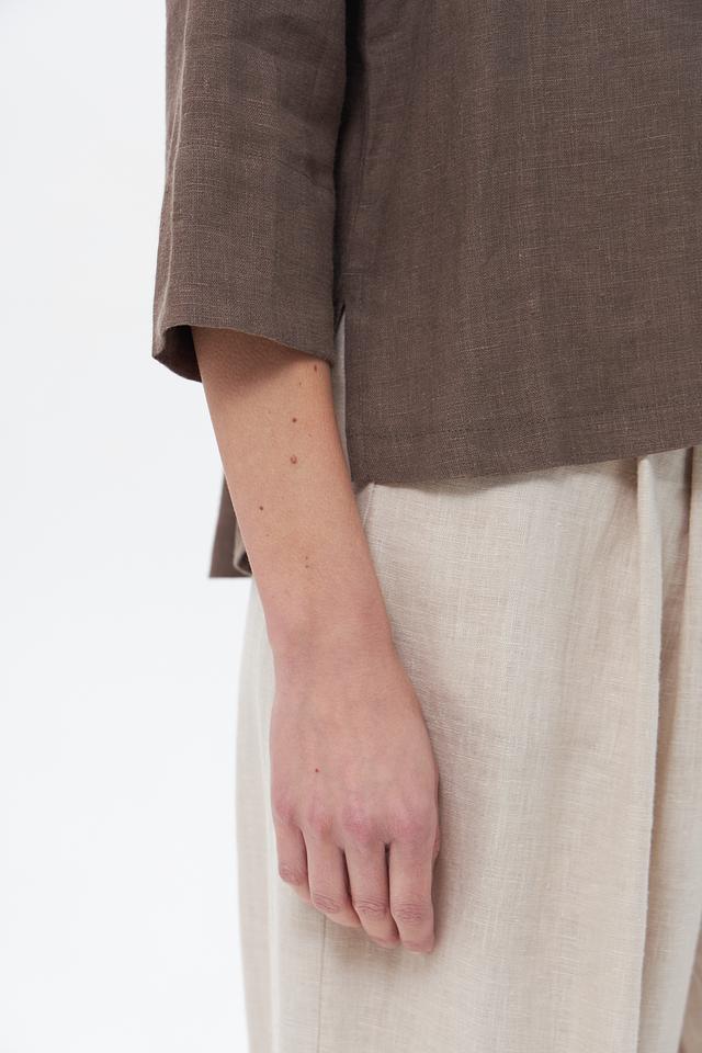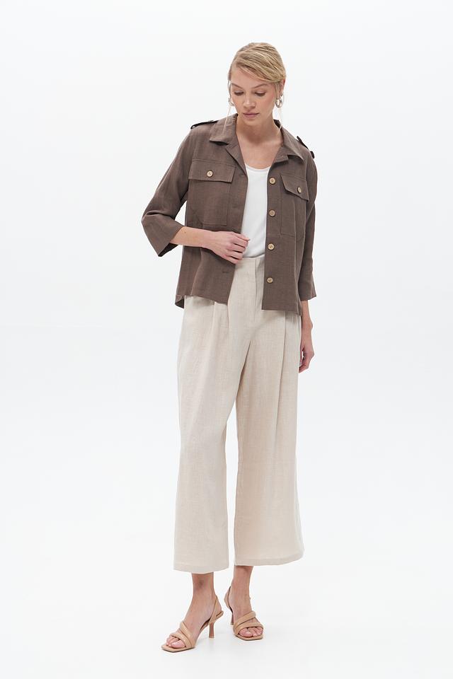 Жакет застегивается на пуговицы, имеет воротник и накладные карманы. Рукава – три четверти. Благодаря использованию 100% льна, жакет отлично пропускает воздух и приятен к телу.