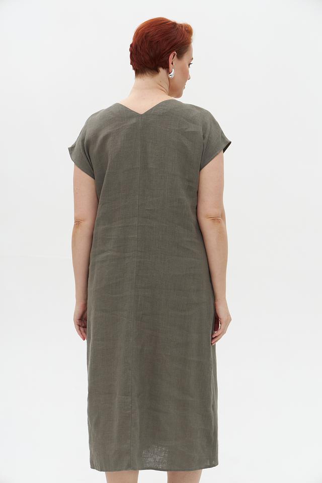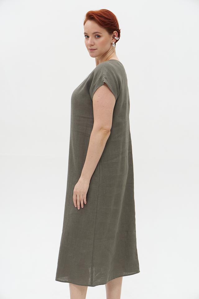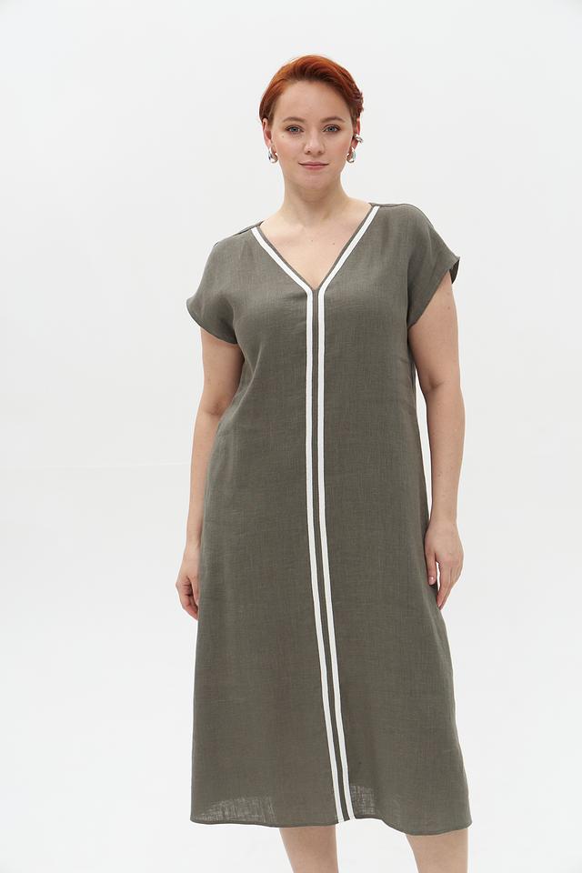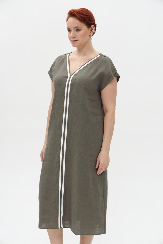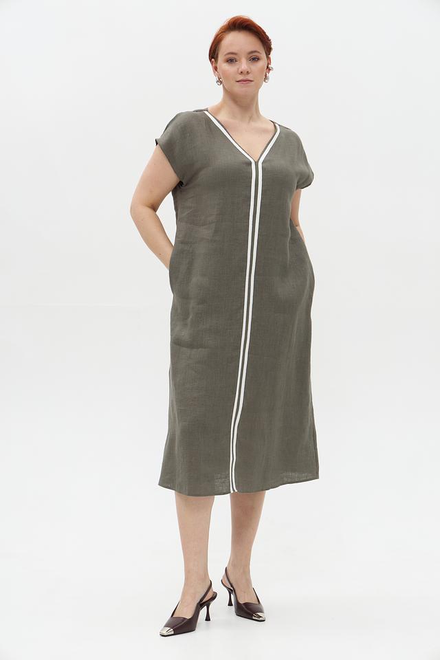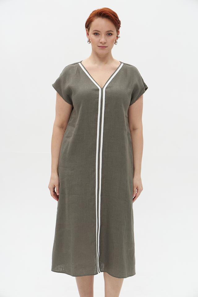 Льняное платье Electra style хаки цвета с контрастной белой отделкой – стильное и комфортное решение для летнего гардероба. Платье прямого кроя с V-образным вырезом и короткими рукавами, выполнено из натурального льна. Состав: лен 100%