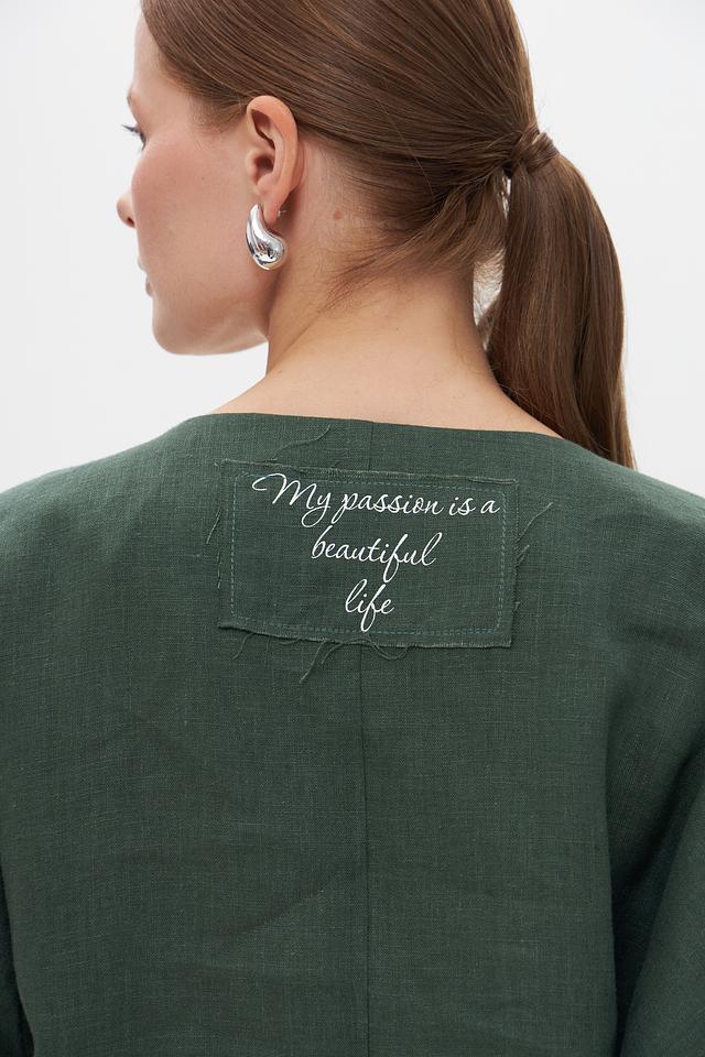 Округлый вырез горловины и короткие рукава с небольшими манжетами придают блузе лаконичный и современный вид. На спине блузы расположена вышивка с надписью “My passion is a beautiful life”, добавляющая ей индивидуальности.