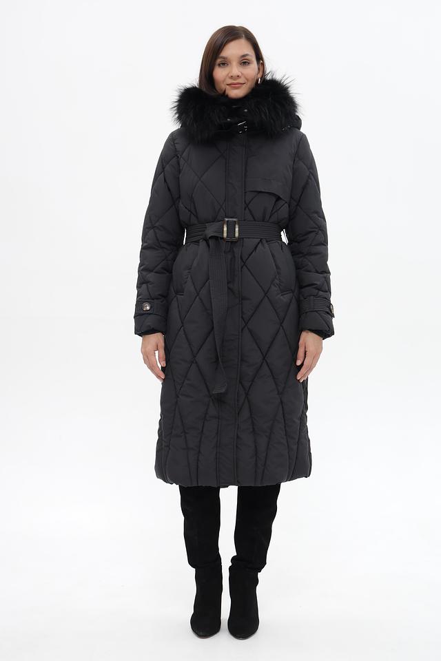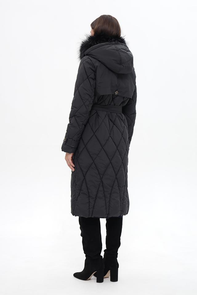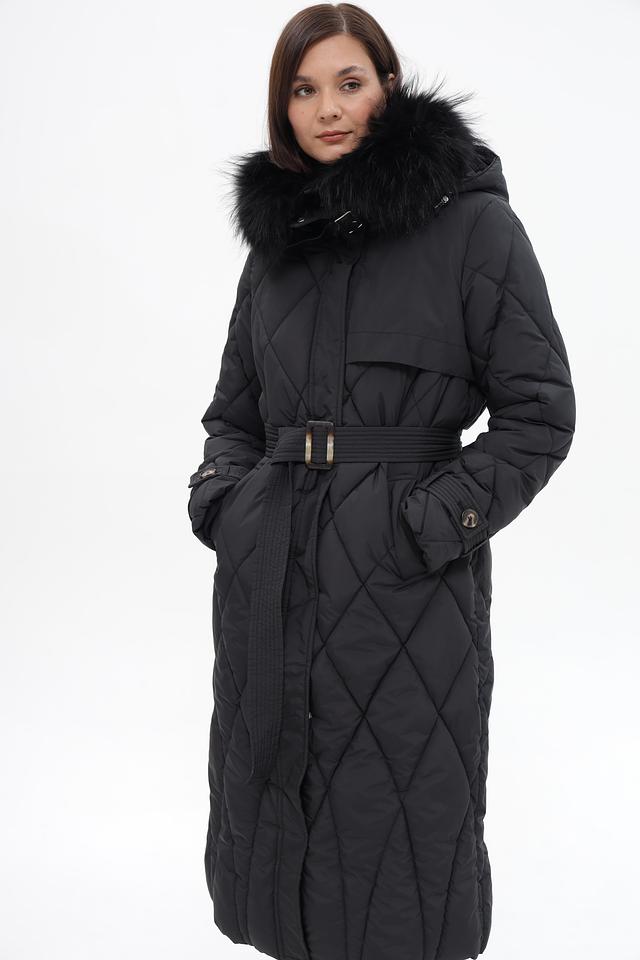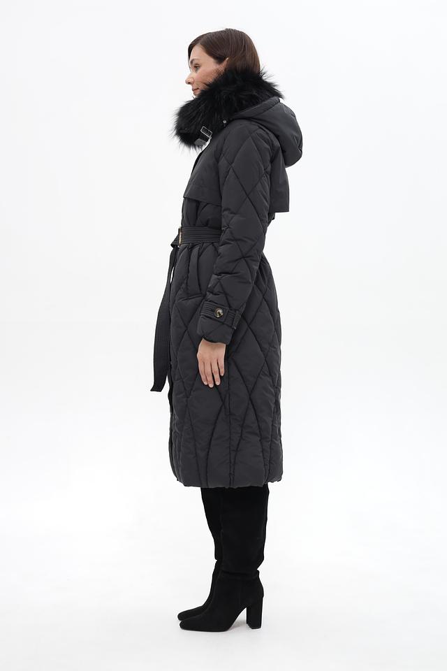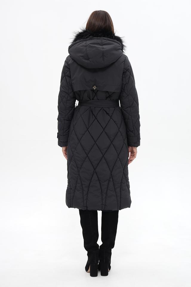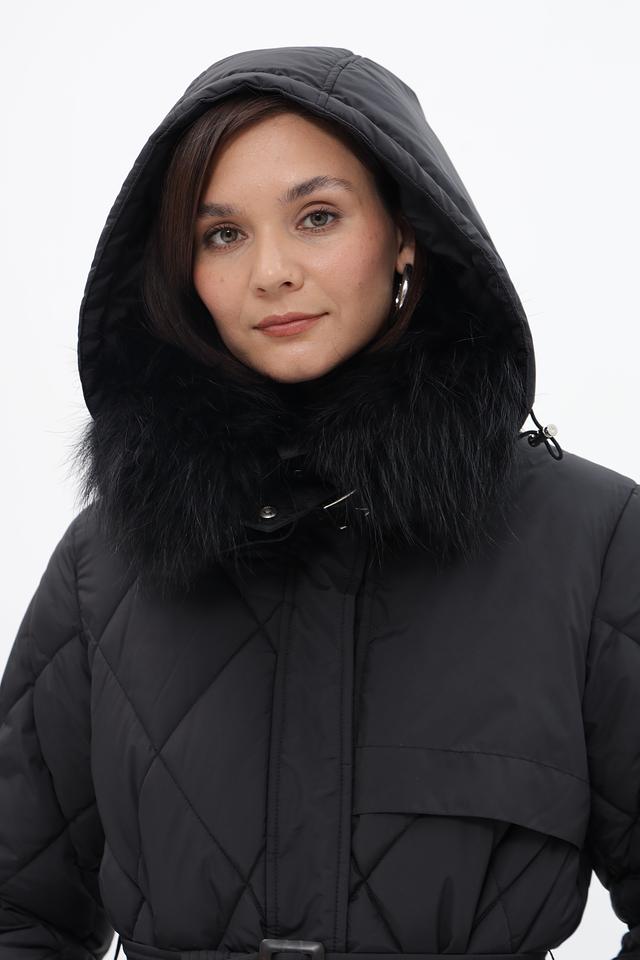 Пальто оснащено удобным капюшоном, отделанным мягким искусственным мехом, который защитит от ветра и снега. Застежка – молния. Талию можно подчеркнуть при помощи съемного пояса с прямоугольной пряжкой.