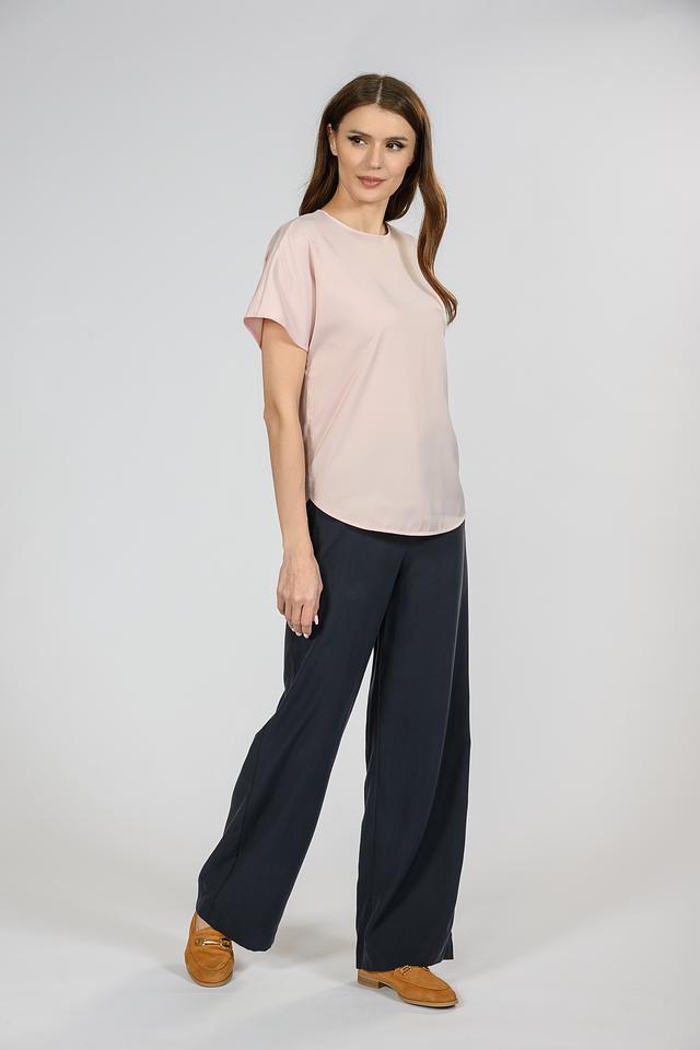 Блуза имеет свободный крой, который не сковывает движения. Короткие рукава делают ее идеальным выбором для теплой погоды. Круглый вырез горловины и небольшой разрез на спине добавляют образу изысканности.