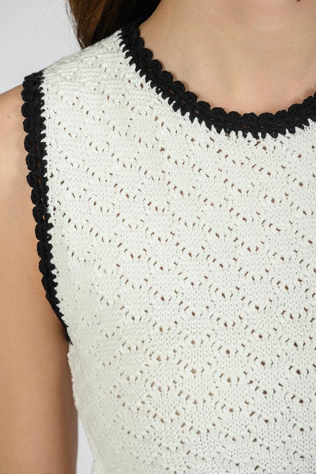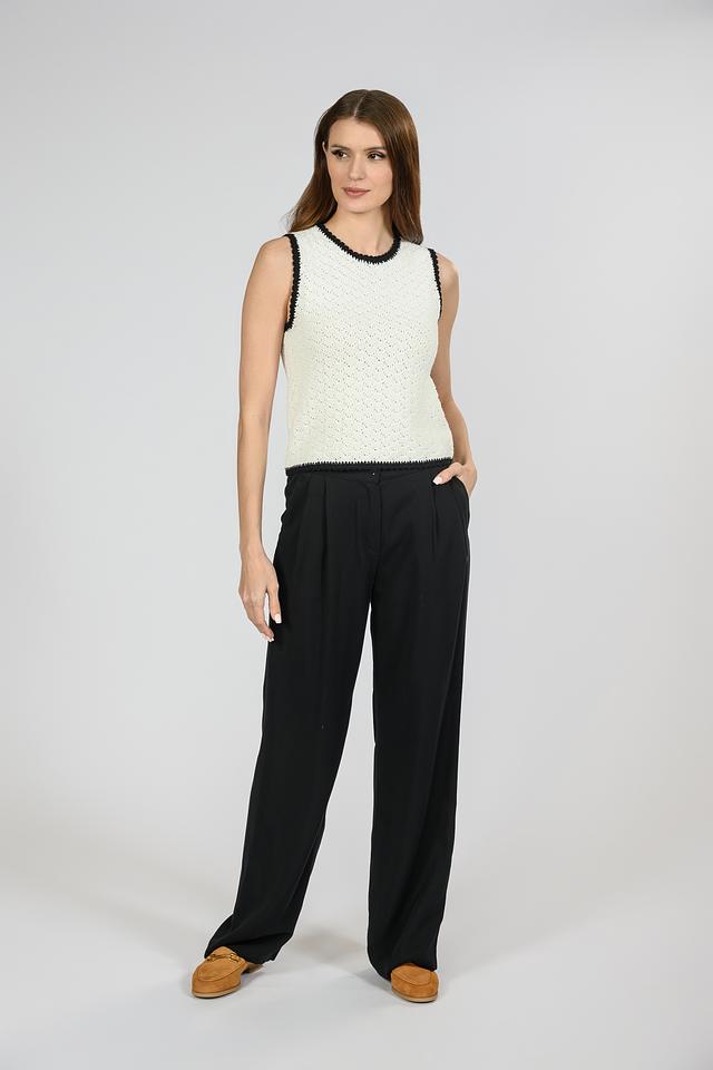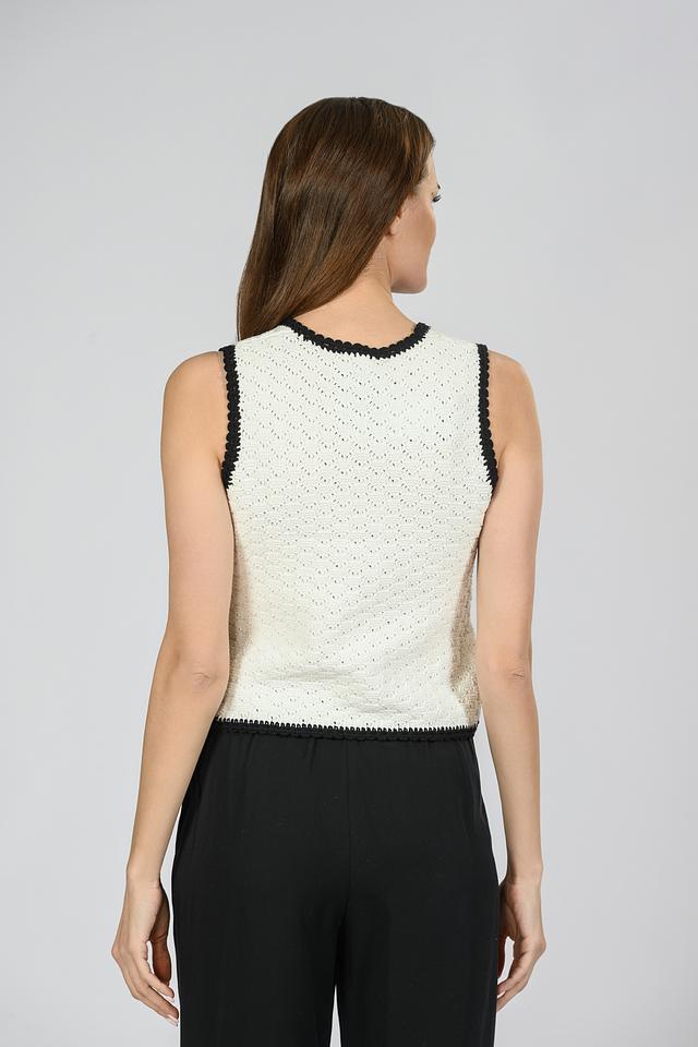 Блуза имеет ажурный дизайн с вязаным узором, который придает ей легкость и воздушность. Горловина и проймы обработаны чёрной тесьмой, что добавляет контраст и завершенность образу.