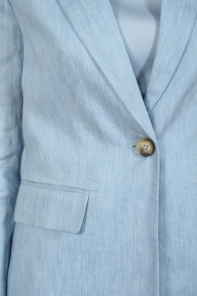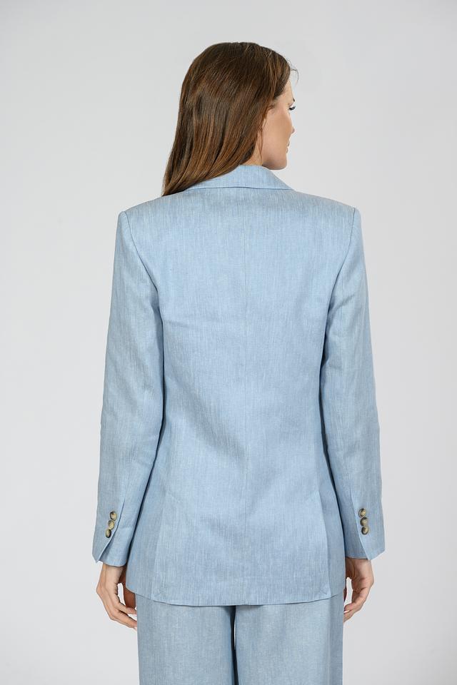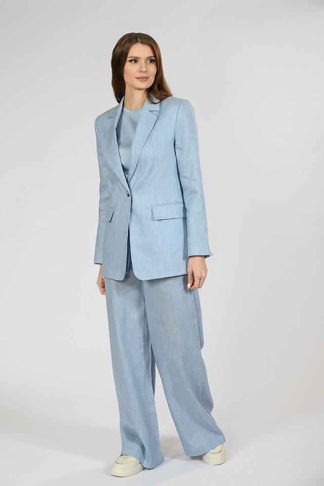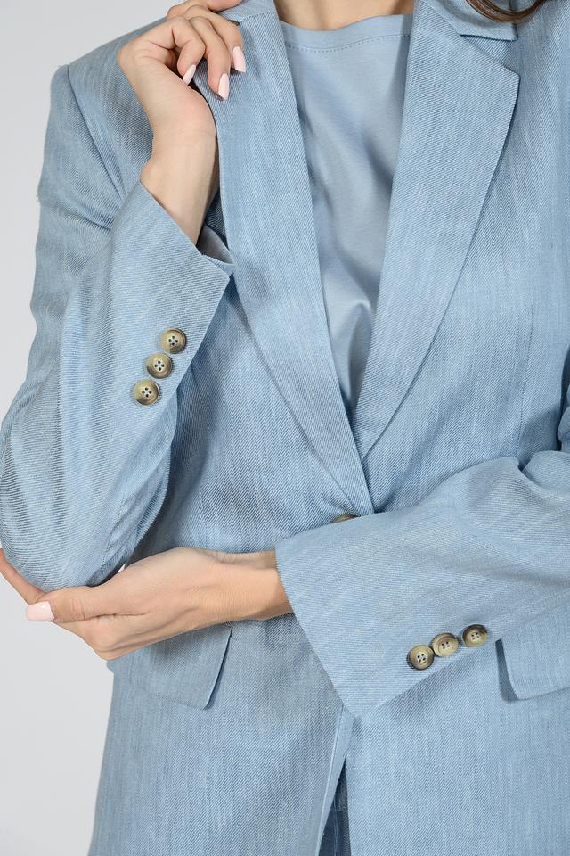Жакет имеет классический крой, лацканы, длинные рукава с декоративными пуговицами на манжетах и застежку на одну пуговицу. Голубой цвет придает изделию свежесть и легкость.