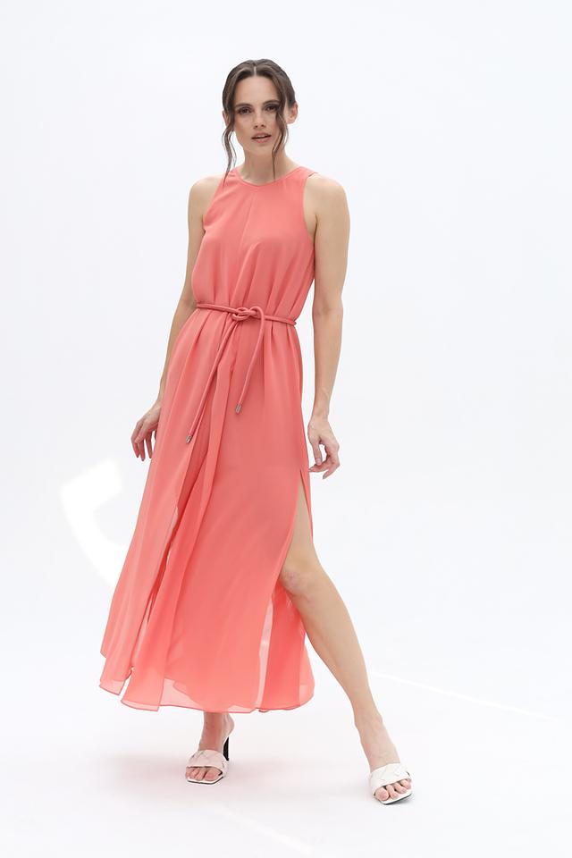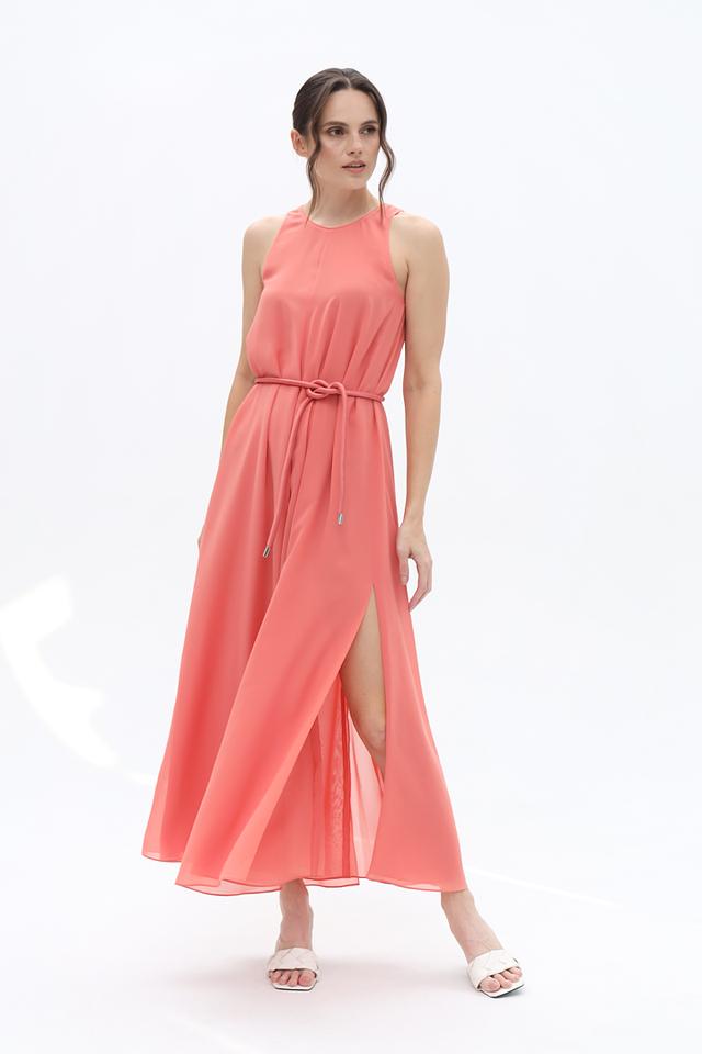 Особенностью модели является высокий разрез спереди, который добавляет образу динамичности и привлекательности. Платье дополнено тонким поясом-завязкой, который позволяет регулировать посадку по талии и создавать более выразительный силуэт.