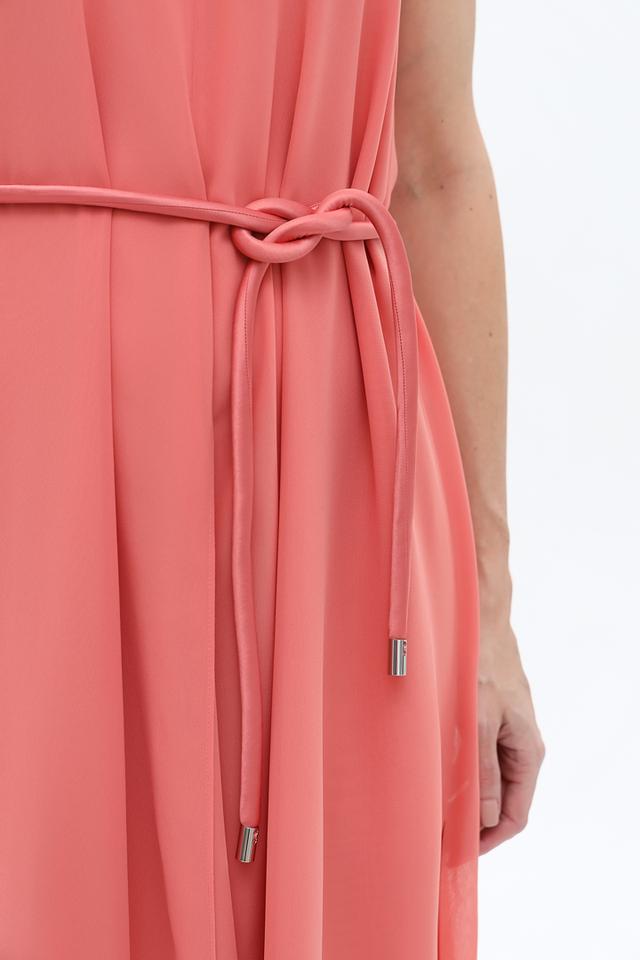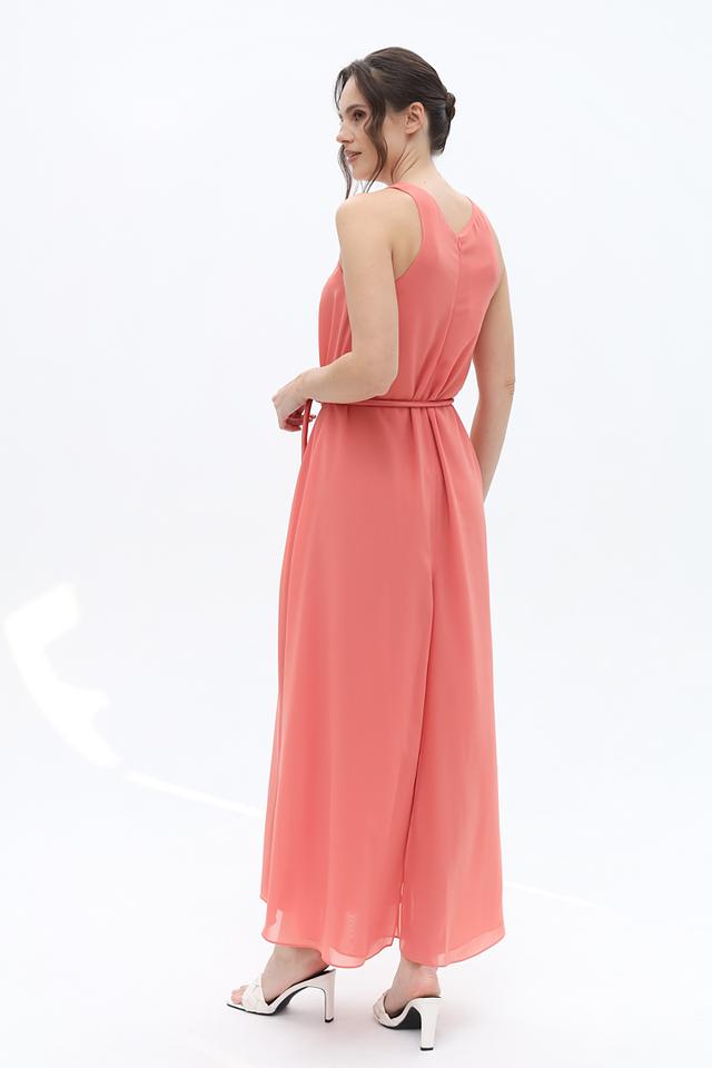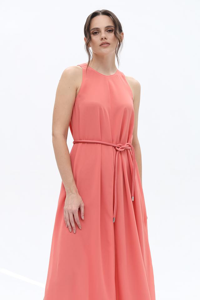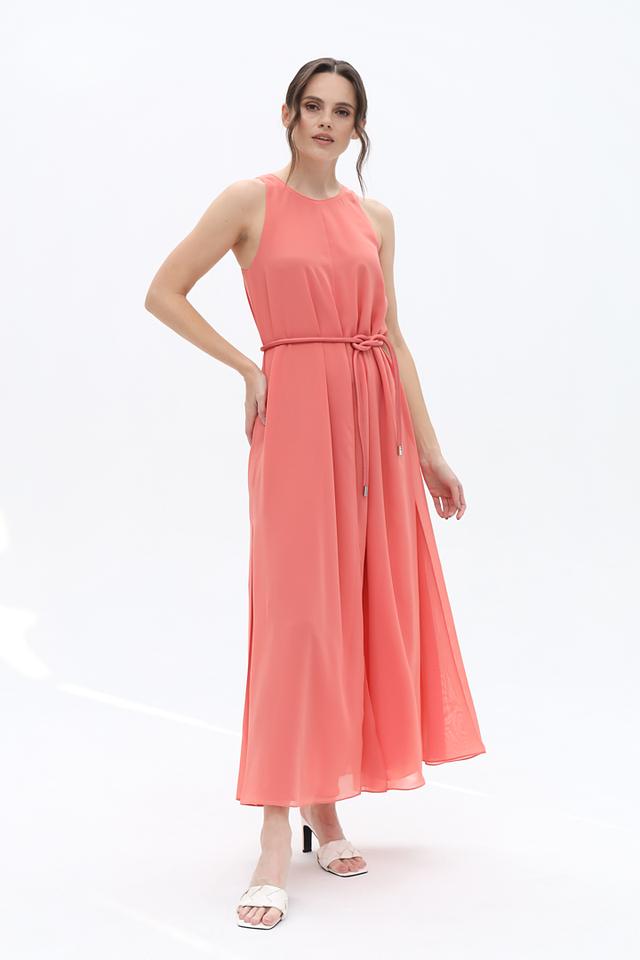 Высокий круглый вырез горловины и отсутствие рукавов делают платье идеальным выбором для теплой погоды. Нежный персиковый цвет придает образу романтичность и женственность. Это платье станет отличным выбором для особых случаев или для повседневной носки, если дополнить его соответствующими аксессуарами.