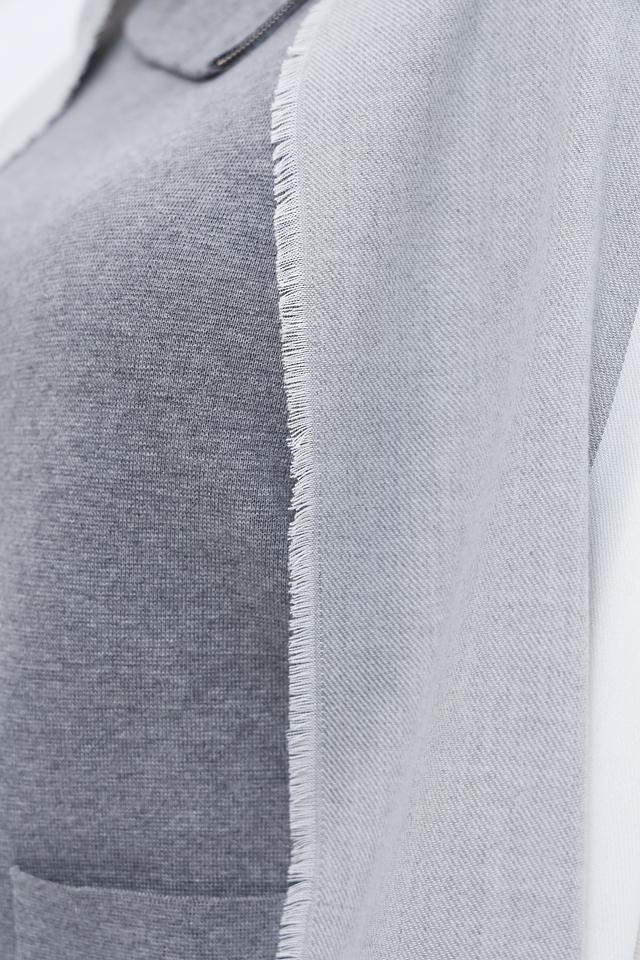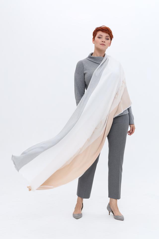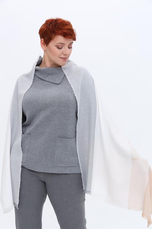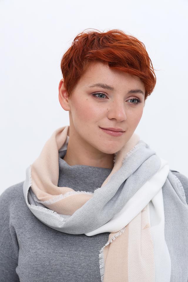 Шарф имеет прямоугольную форму и выполнен в двухцветной гамме: сочетание серого и бежевого оттенков делает его универсальным и подходящим для различных стилей одежды. Бахрома по краям добавляет шарфу изысканности и завершенности.