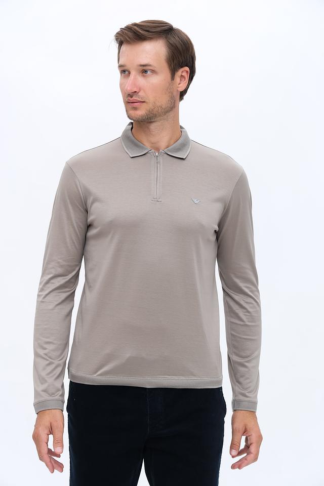 Джемпер имеет классический крой и воротник-поло с короткой молнией, что придает ему современный вид. Небольшой логотип бренда на груди подчеркивает его принадлежность к премиальному сегменту.