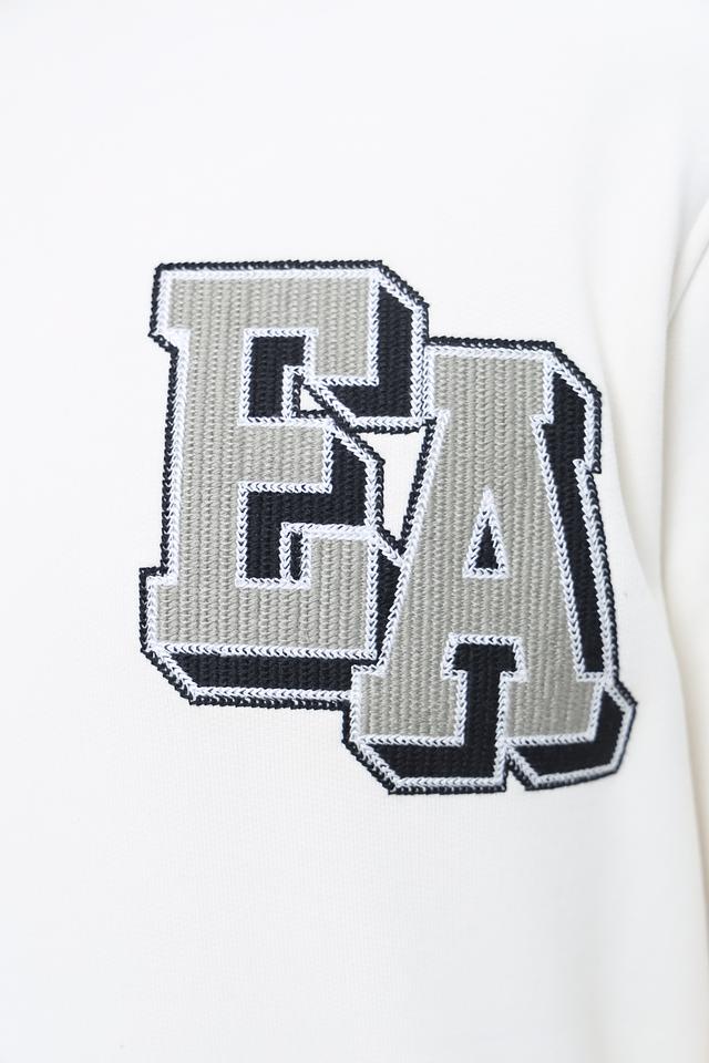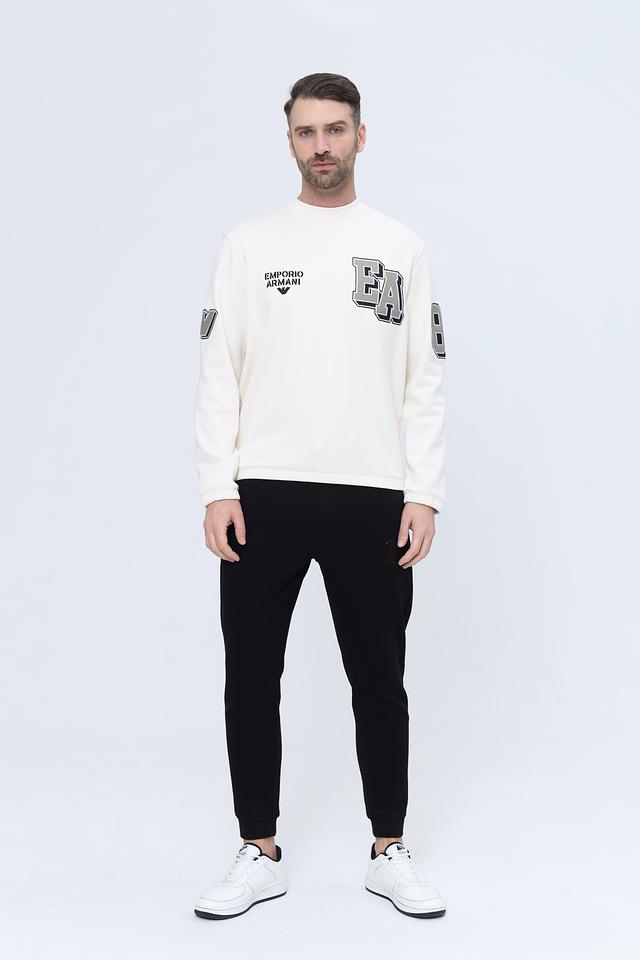 Дизайн джемпера включает в себя крупные элементы с логотипом бренда, выполненные в контрастных цветах. На груди расположен логотип "Emporio Armani", а на спине – надпись "1981" и "Milano", выполненные в ретро-стиле. Дополнительные декоративные элементы в виде полос на рукавах придают джемперу спортивный вид.