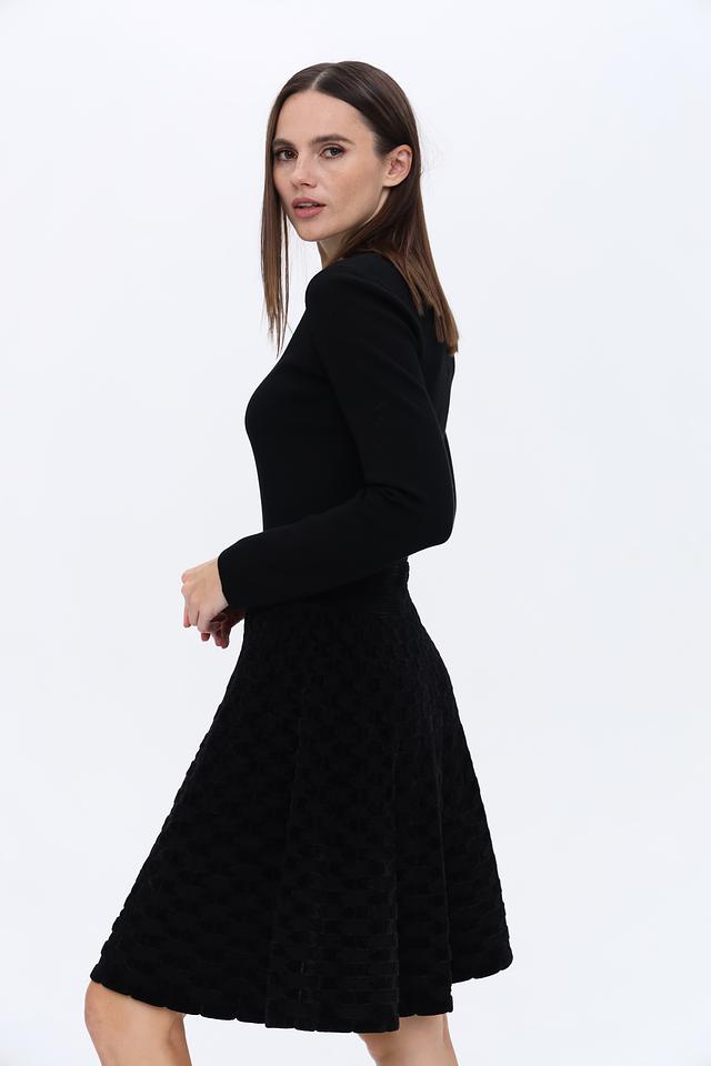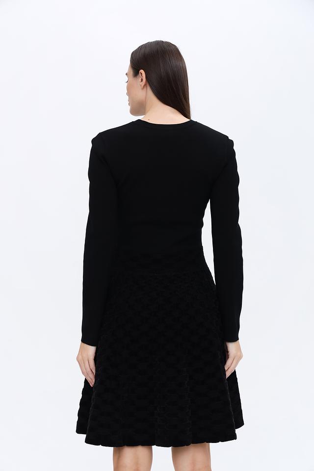 Черное платье от Emporio Armani с комбинированной текстурой верха и юбки. Модель имеет длинные рукава и приталенный силуэт, идеально подходит для создания элегантного образа. Состав: полиэстер 84%, вискоза 16%