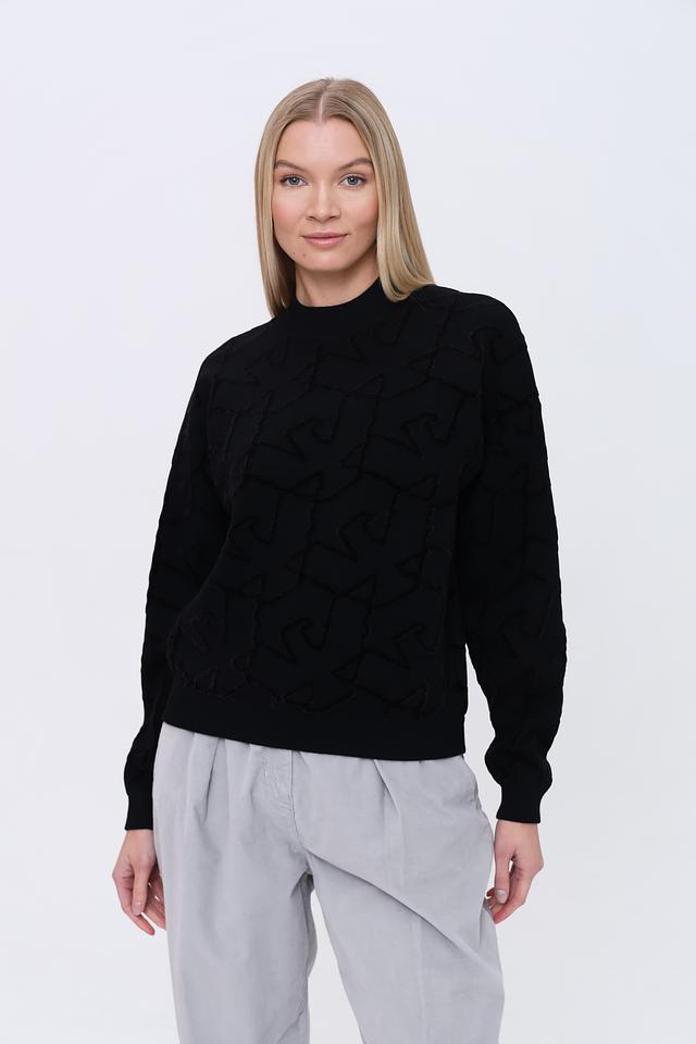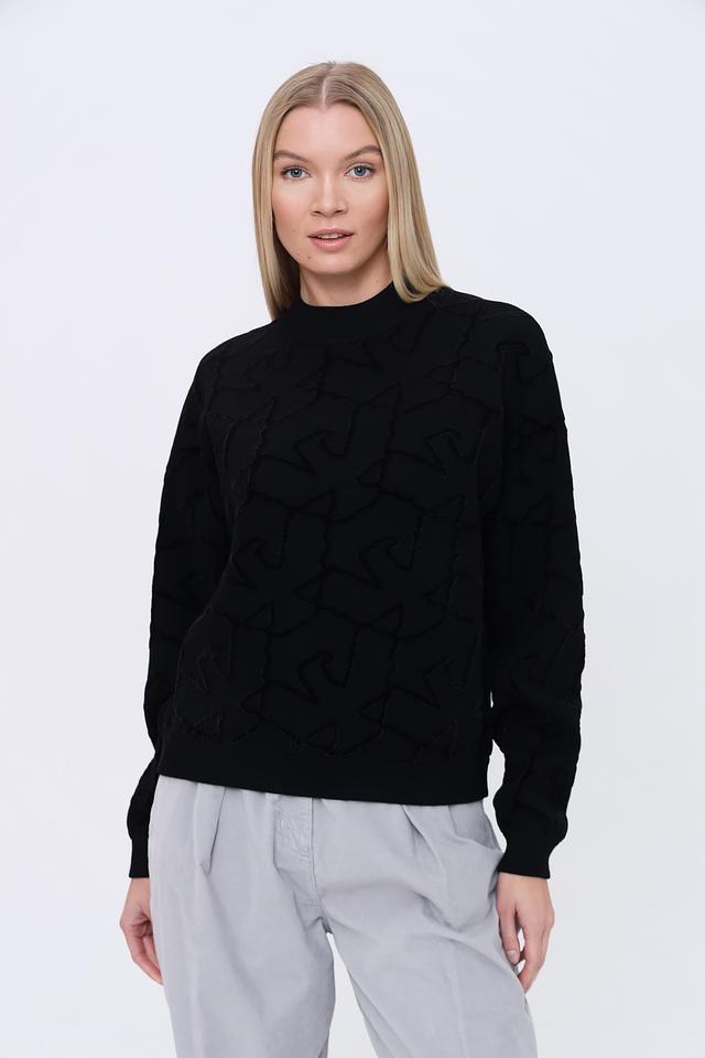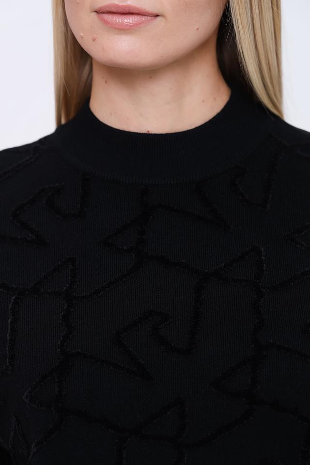 Чёрный джемпер от Emporio Armani с оригинальным геометрическим узором. Изготовлен из мягкого сочетания полиэстера и вискозы, обеспечивающего комфорт и удобство в носке. Стильное и универсальное решение для создания элегантного образа. Состав: полиэстер 51%, вискоза 49%