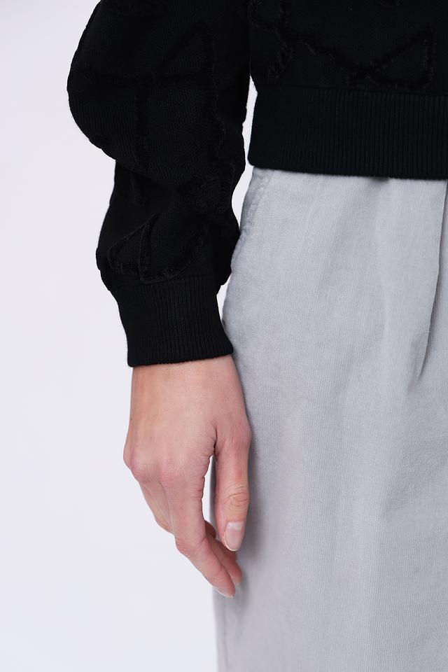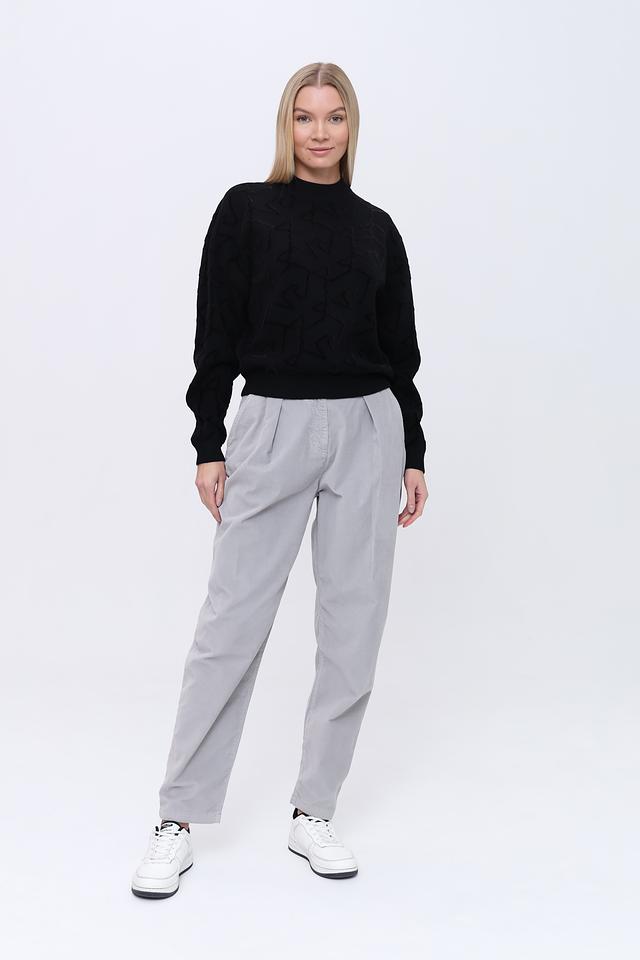 Особенностью модели является выразительный геометрический узор, который придает ей индивидуальность и современный вид. Джемпер имеет круглый вырез горловины и длинные рукава.