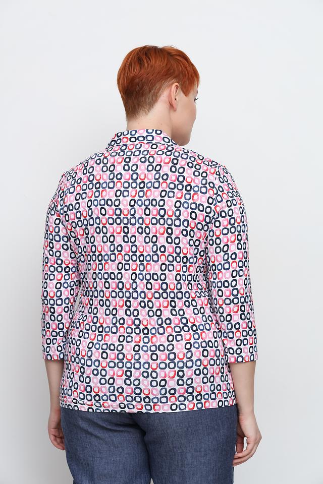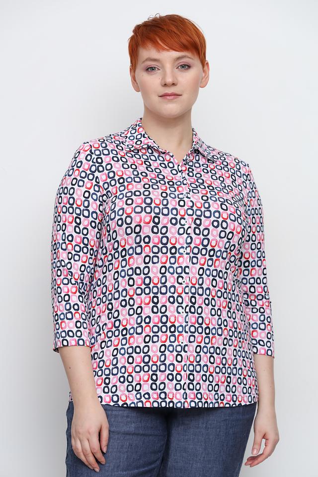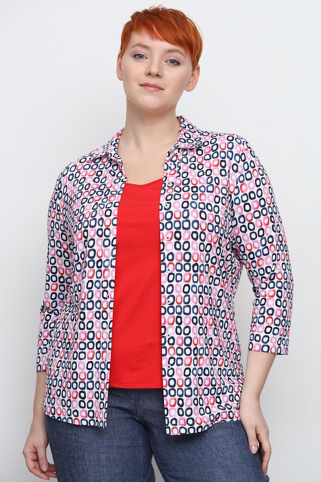 Рубашка имеет прямой крой и короткий рукав, что делает ее идеальным выбором для теплой погоды. Особенностью модели является яркий и оригинальный геометрический принт, выполненный в сочетании розовых, красных и черных оттенков на белом фоне.