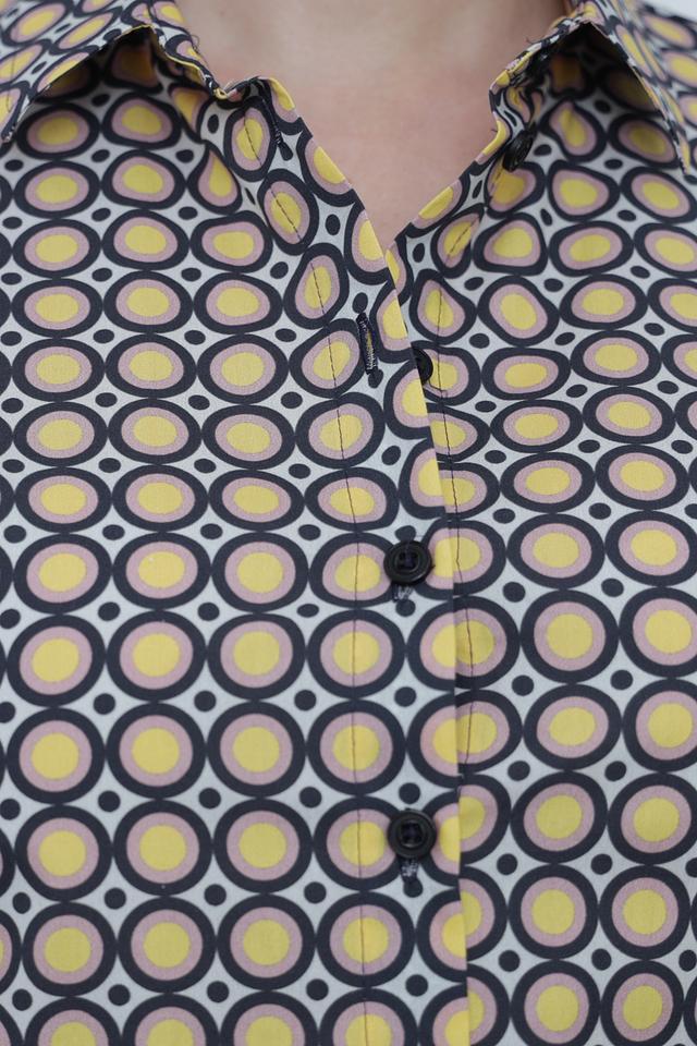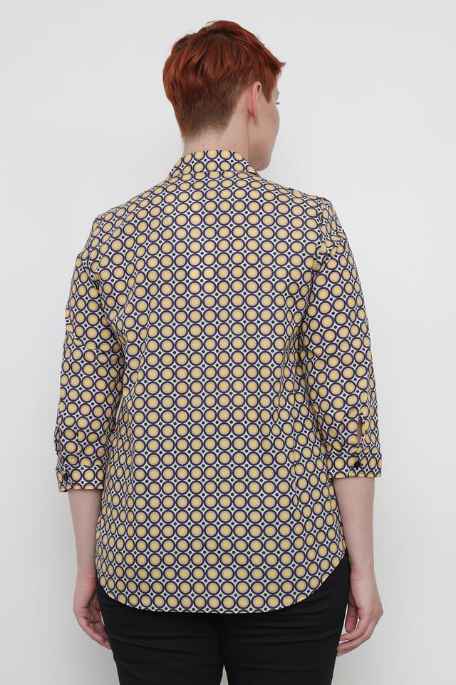 Женская рубашка Erfo жёлтого цвета с оригинальным геометрическим принтом станет стильным дополнением к вашему гардеробу. Модель выполнена из 100% хлопка, обеспечивая комфорт в носке. Состав: хлопок 100%