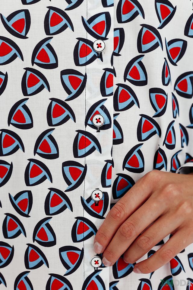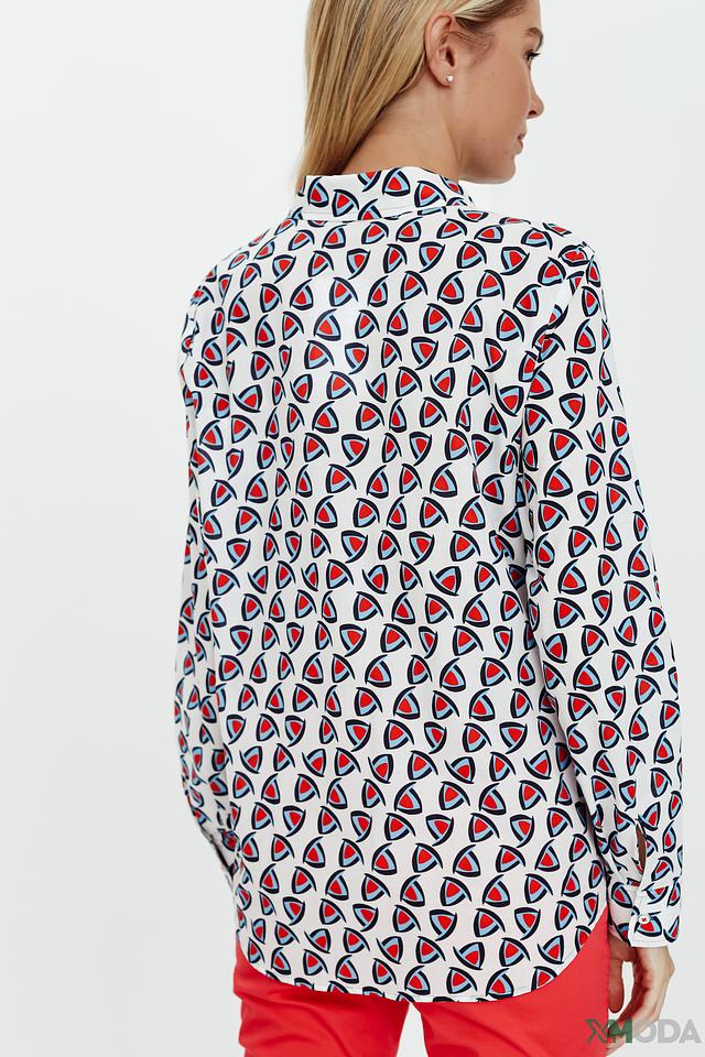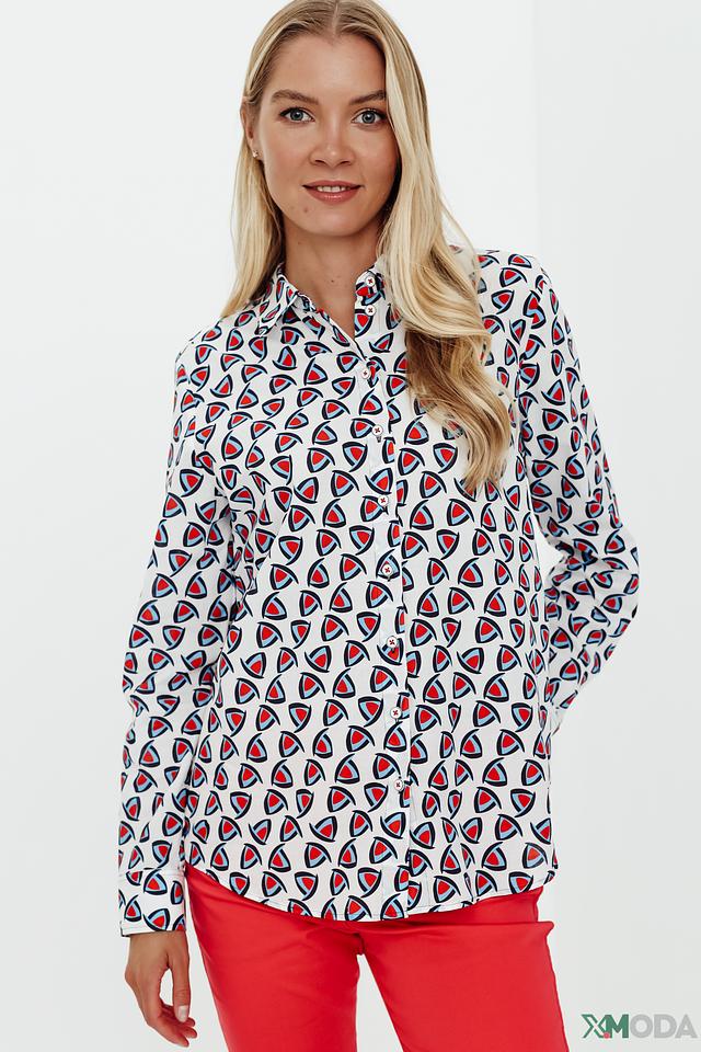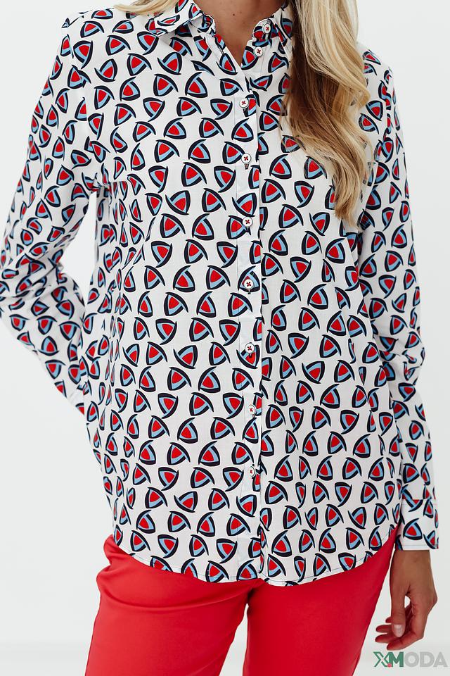 Рубашка имеет классический крой с длинными рукавами и отложным воротником. Её особенностью является оригинальный принт, состоящий из геометрических фигур в красных и синих тонах на белом фоне. Эта деталь делает рубашку уникальной и привлекательной.