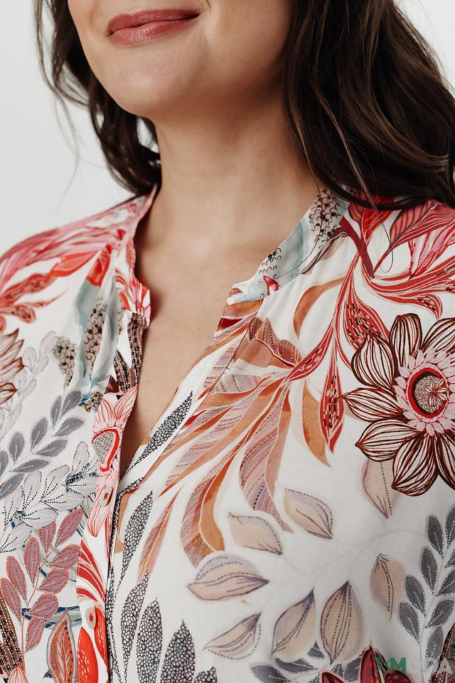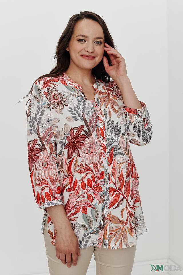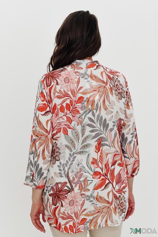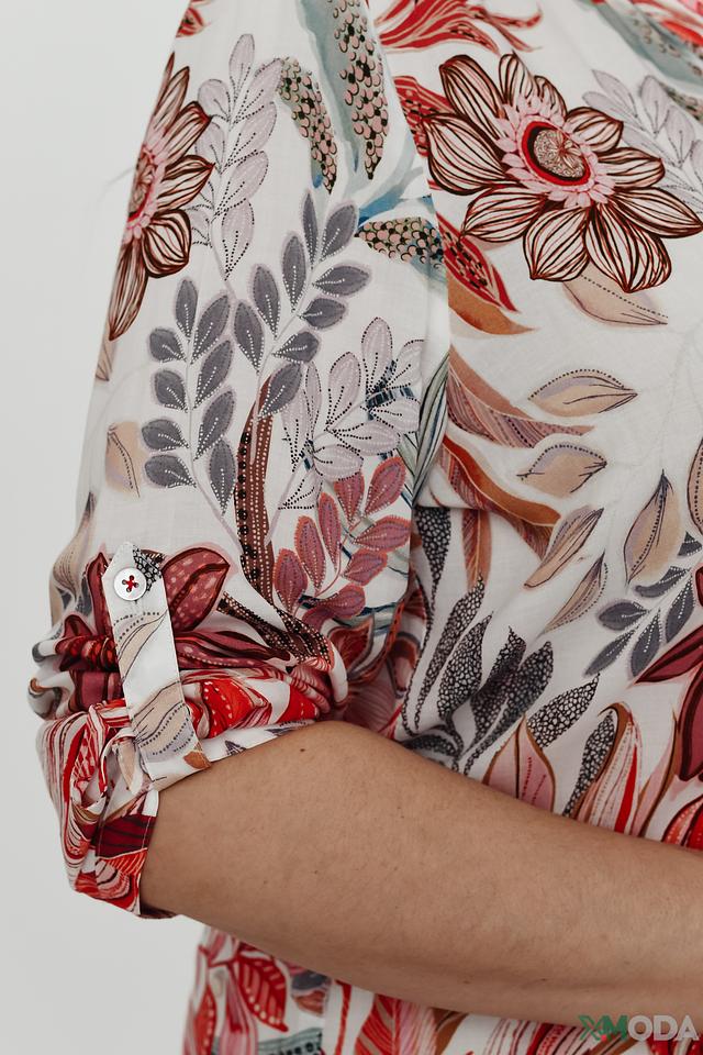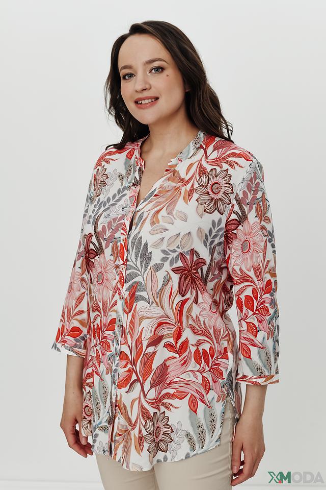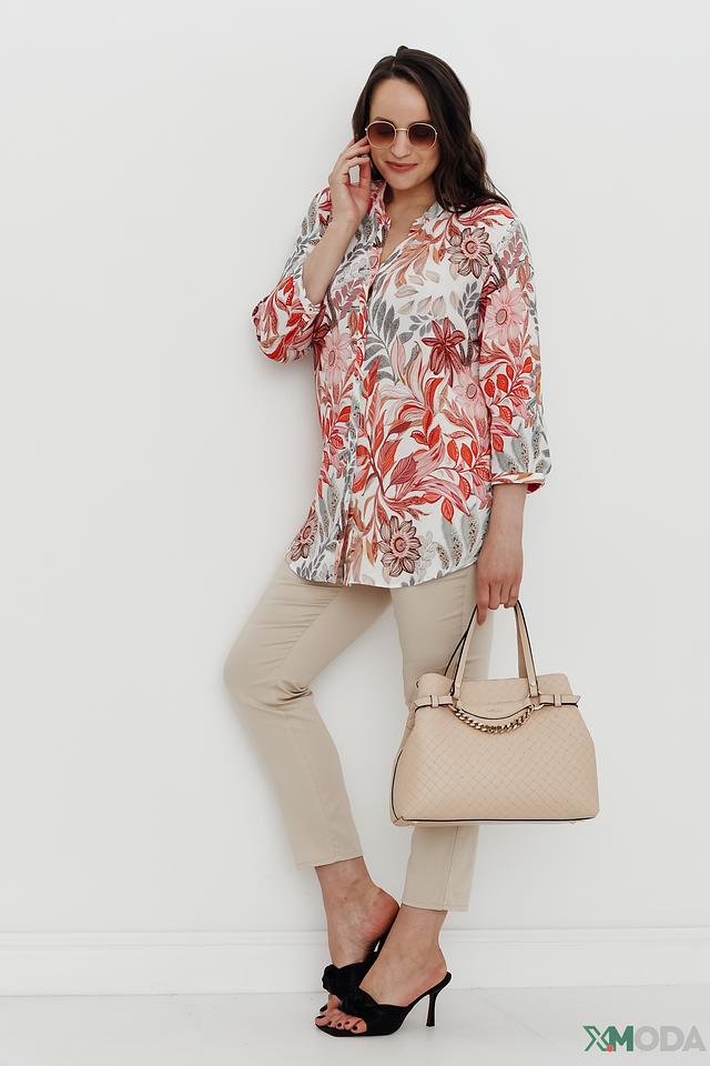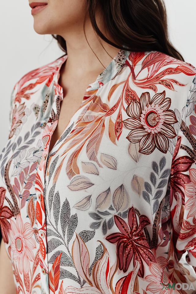 Основной цвет блузы – белый, но ее главным украшением является яркий и красочный цветочный принт, выполненный в оттенках красного, оранжевого, серого и голубого. Этот принт делает блузу особенно привлекательной и позволяет создавать яркие и запоминающиеся образы.