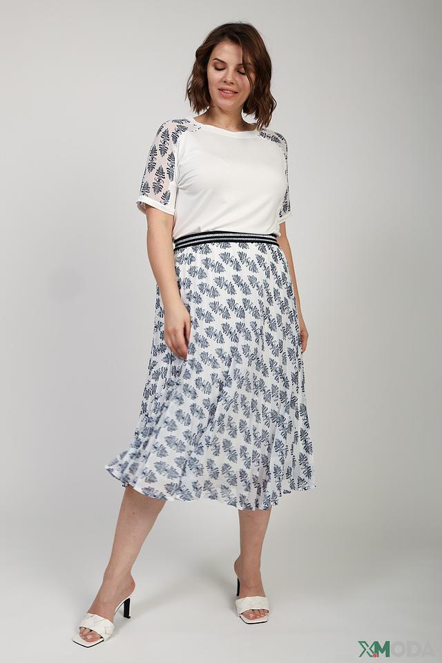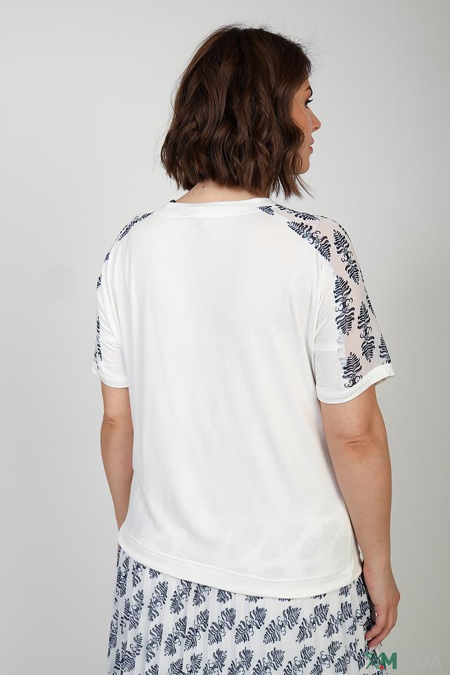 Особенностью модели является принт на плечах, выполненный в тёмно-синих тонах. Короткие рукава и округлый вырез горловины обеспечивают комфорт в носке. Блуза выполнена из высококачественной вискозы с добавлением эластана, что делает её приятной к телу и хорошо сохраняющей форму.