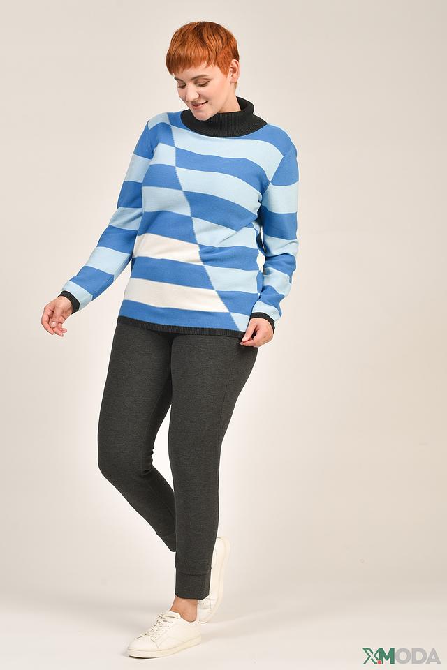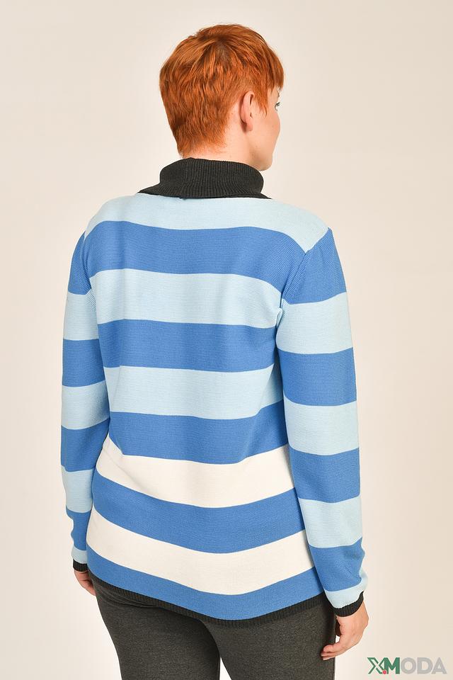 Водолазка имеет классический крой с длинными рукавами и высоким воротником. Голубая полосатая расцветка придает образу свежесть и динамичность. Черный воротник контрастирует с основным цветом, добавляя изысканности.