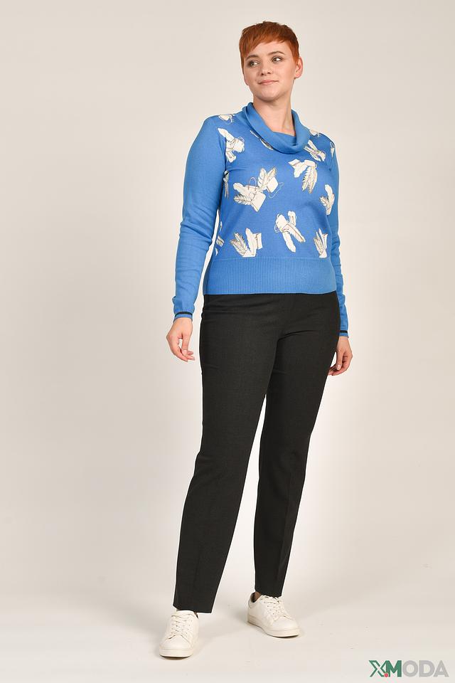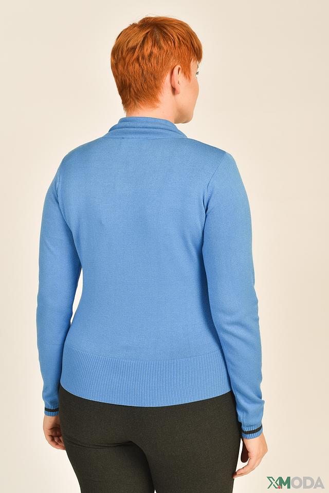 Пуловер имеет воротник-стойку, который добавляет образу изысканности. Рукава длинные, манжеты и нижний край изделия выполнены из эластичной резинки в тон основной ткани. Текстура полотна сочетает в себе гладкую лицевую сторону и рельефную вязку на нижней части.