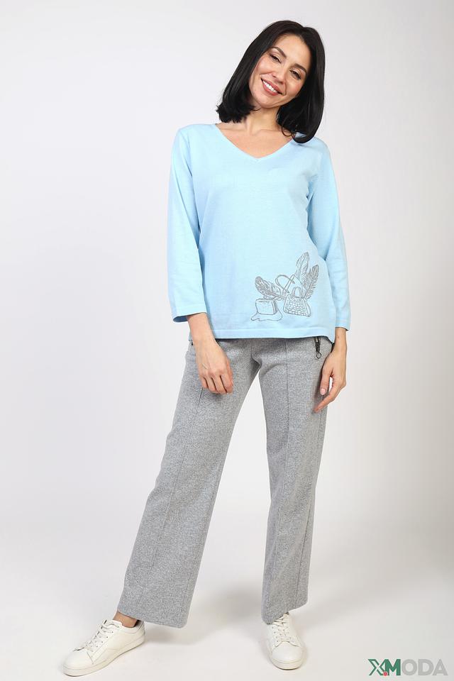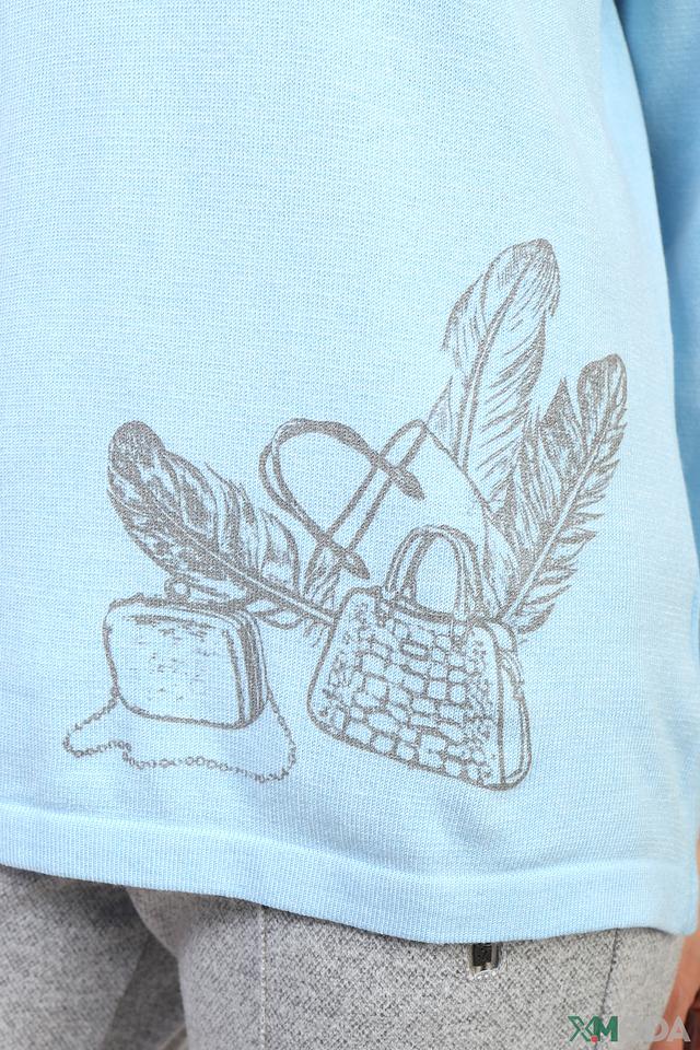 Женский пуловер Eugen Klein голубого цвета с оригинальным принтом в виде сумок и хлеба. Модель имеет V-образный вырез и рукава 3/4, выполнен из мягкого и приятного к телу трикотажа. Состав: модал 46%, полиакрил 40%, полиамид 14%
