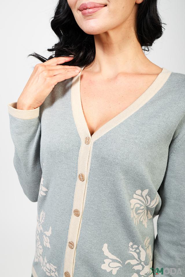 Жакет имеет V-образный вырез и застегивается на ряд пуговиц. Рукава длинные, манжеты и планка выполнены в бежевом цвете, что создает контрастный и стильный эффект.