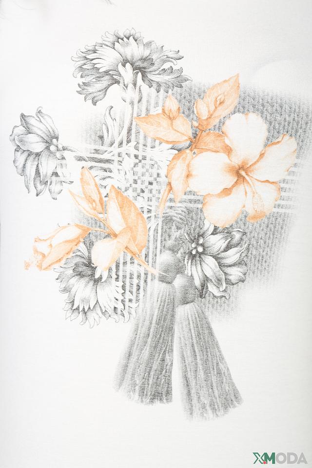 Футболка имеет классический прямой крой и округлый вырез горловины. Короткие рукава делают ее идеальным выбором для теплой погоды. Главной особенностью модели является оригинальный цветочный принт, выполненный в нежных оттенках.