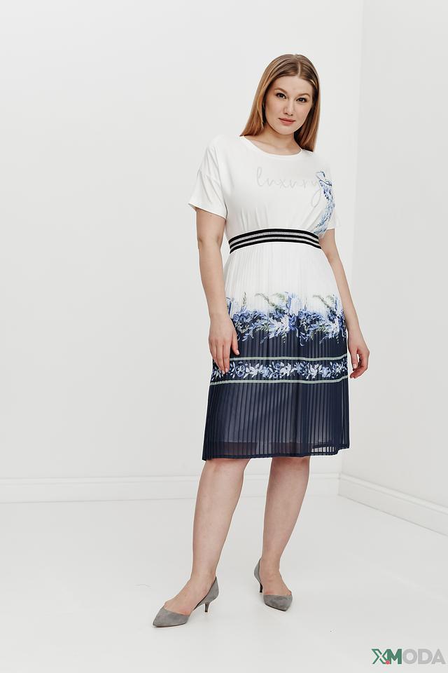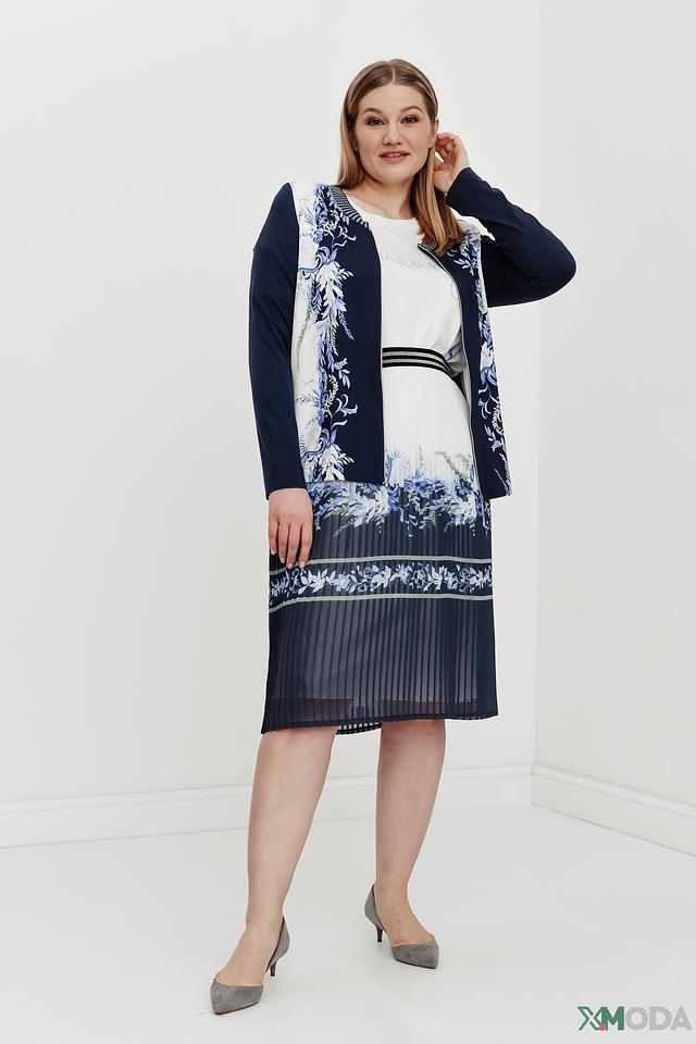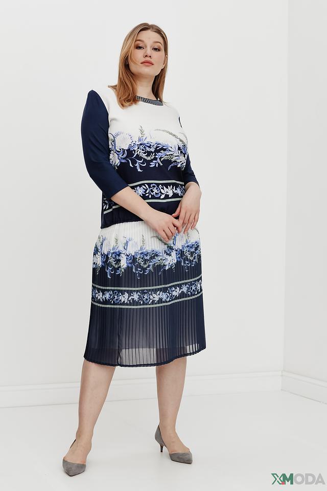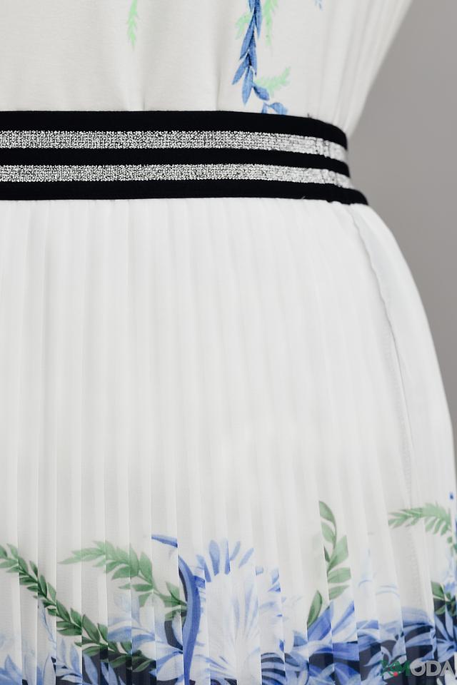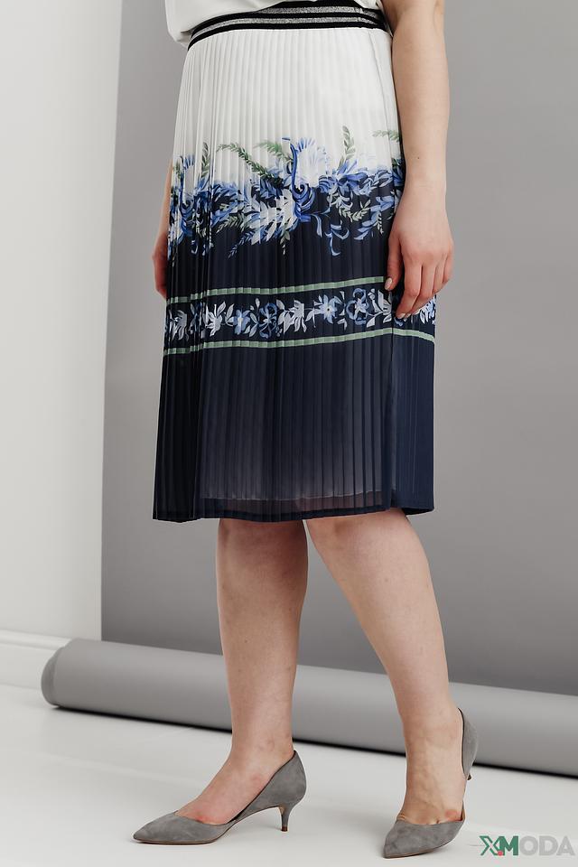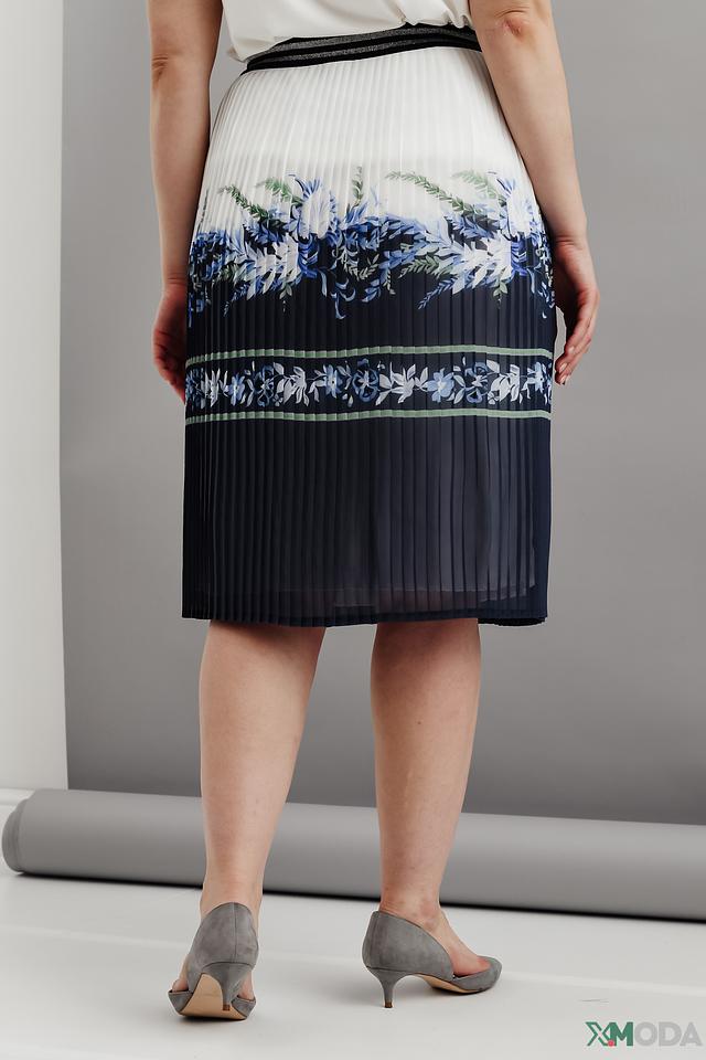 Юбка имеет плиссированный крой, который придает ей изящный и женственный вид. Основной цвет юбки – тёмно-синий, а также присутствует цветочный принт в бело-голубых тонах. Принт расположен в верхней части юбки, плавно переходя в однотонную плиссировку.