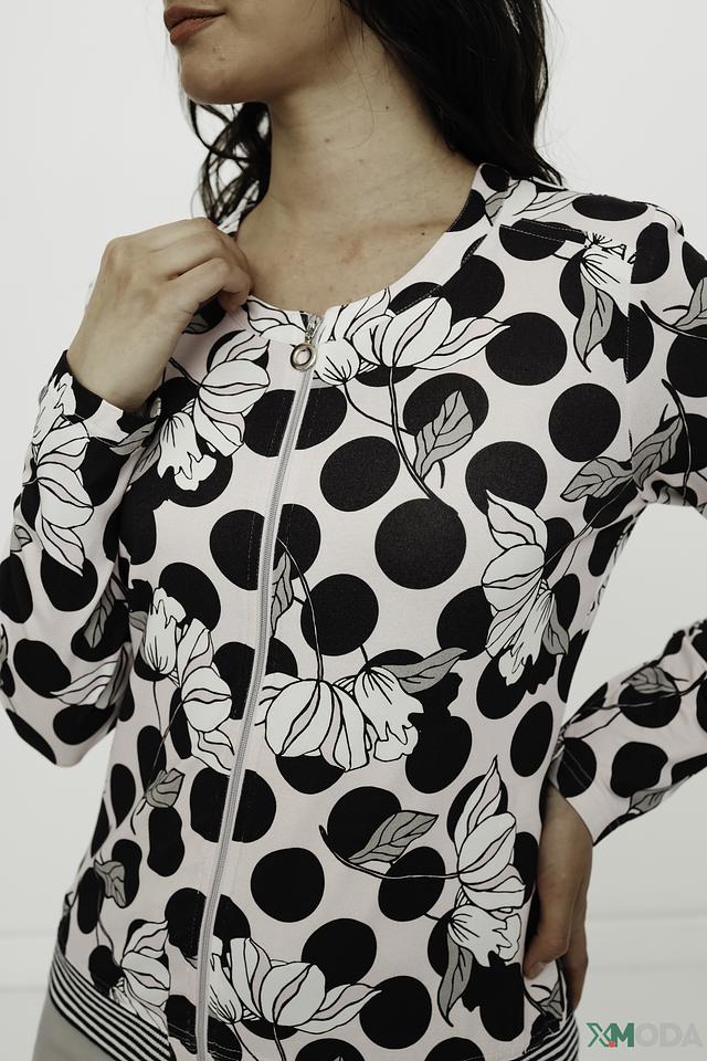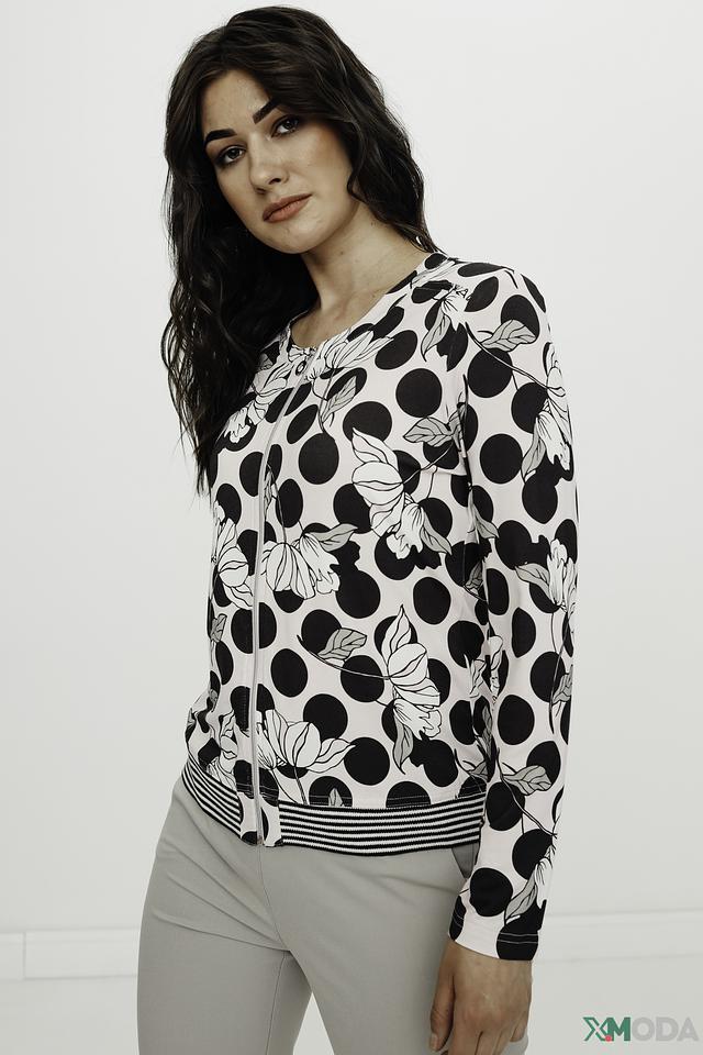 Модель имеет застежку-молнию, короткий рукав и эластичную резинку по низу изделия и на рукавах, что обеспечивает удобную посадку по фигуре. Жакет выполнен из высококачественной вискозы с добавлением эластана, благодаря чему он приятен к телу, хорошо держит форму и практически не мнется.