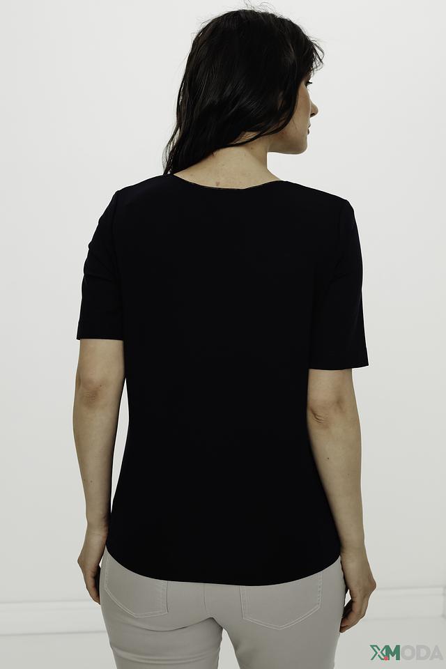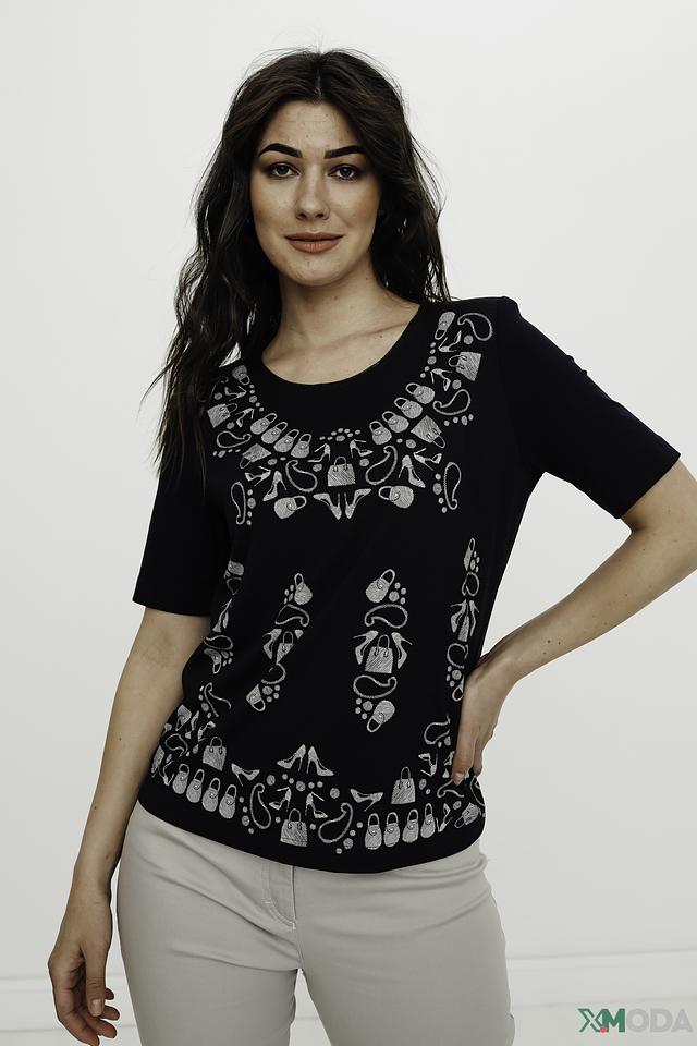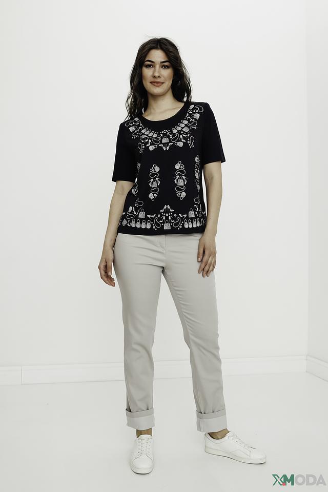 Фасон футболки – прямой, с короткими рукавами и округлым вырезом горловины. Такая модель хорошо сочетается с различными предметами одежды, от джинсов и брюк до юбок и шорт. Футболка идеально подходит для создания повседневных образов, а также для более нарядных вариантов.