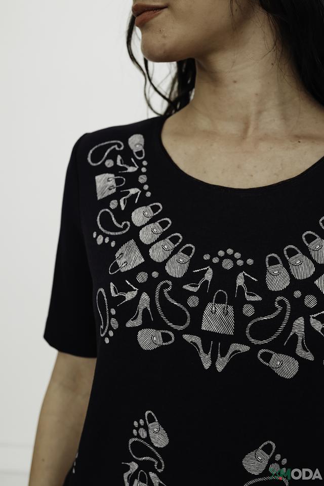 Основной цвет футболки – чёрный, а её особенностью является стильный принт в белых тонах, расположенный на лицевой стороне. Принт выполнен в виде абстрактного рисунка, придающего изделию оригинальность и индивидуальность.