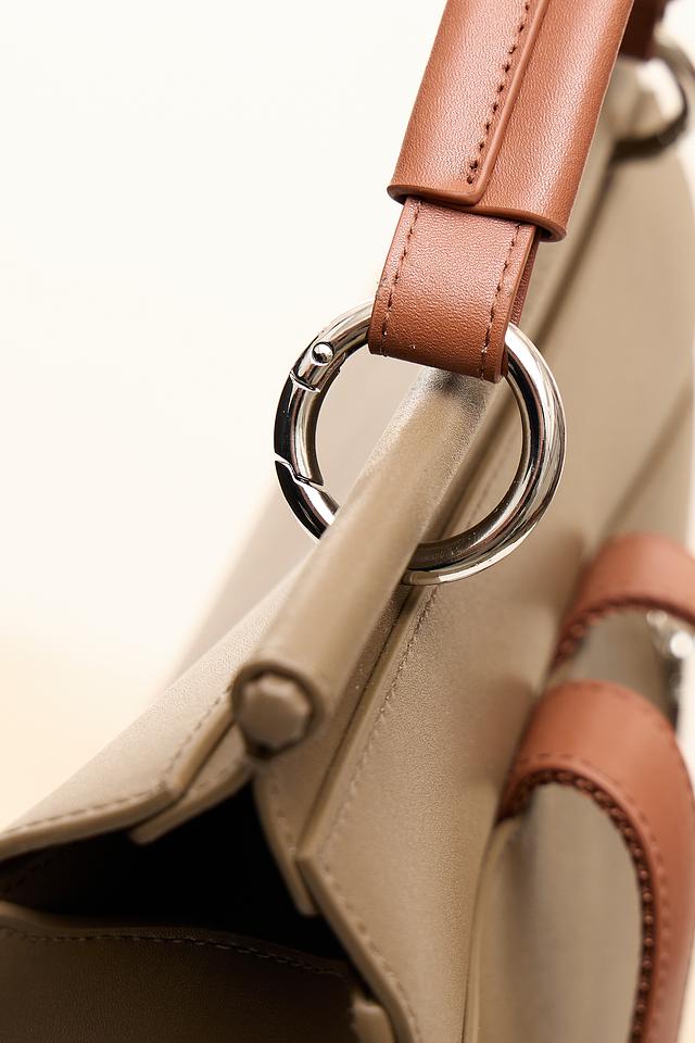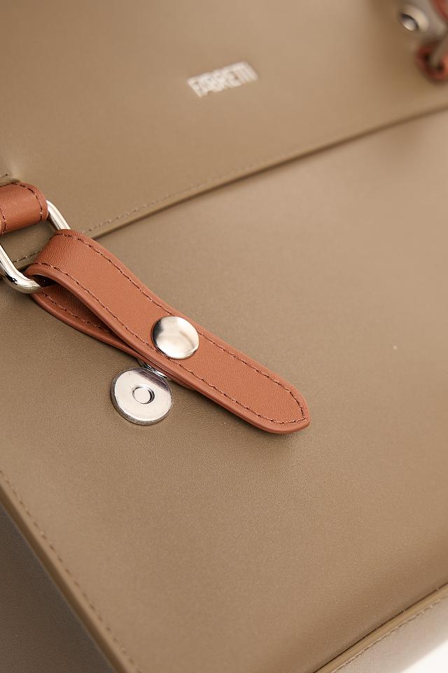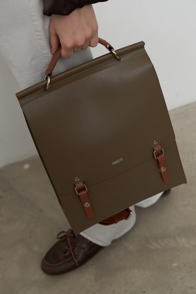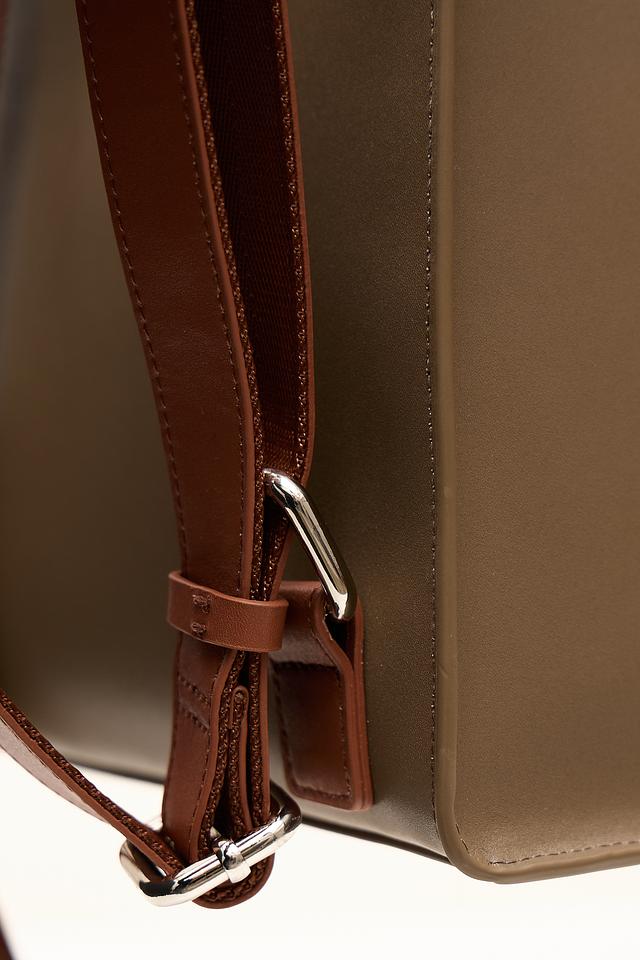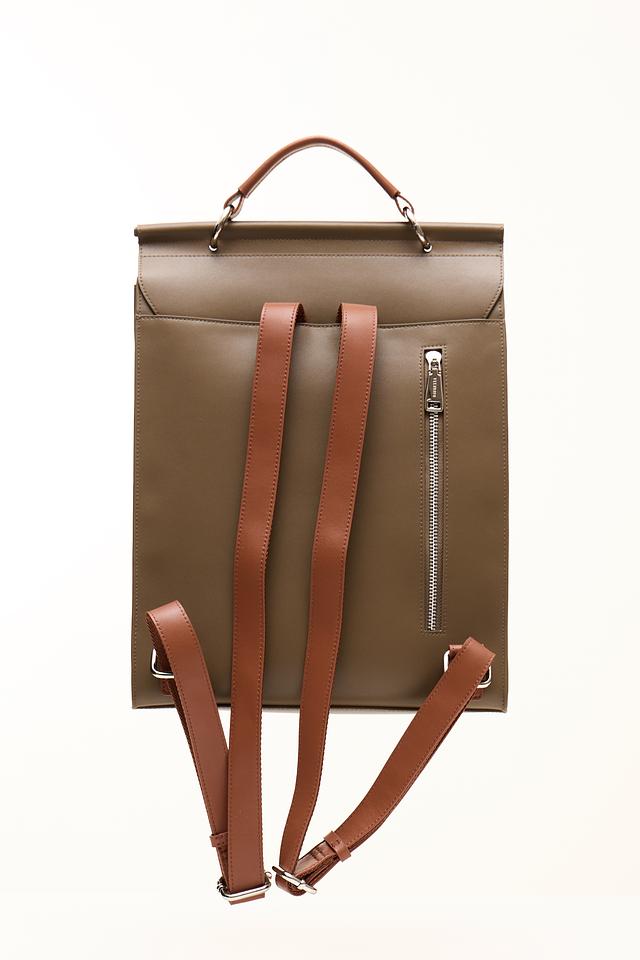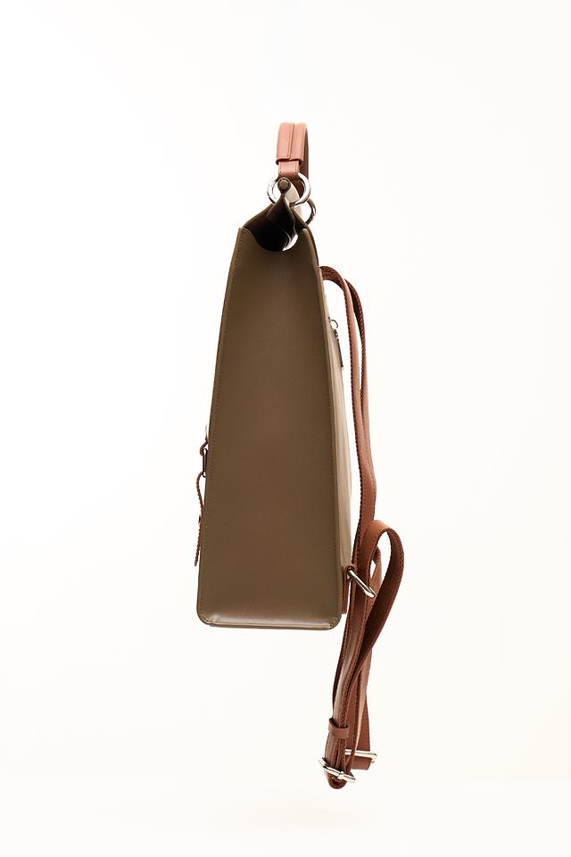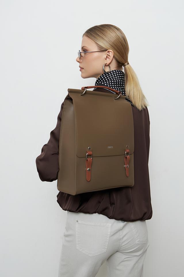 Рюкзак имеет прямоугольную форму и выполнен из искусственной кожи, что придает ему элегантный и современный вид. Отличительной особенностью является отделка из коричневой искусственной кожи на передней панели и лямках, а также декоративные элементы с металлическими застежками.