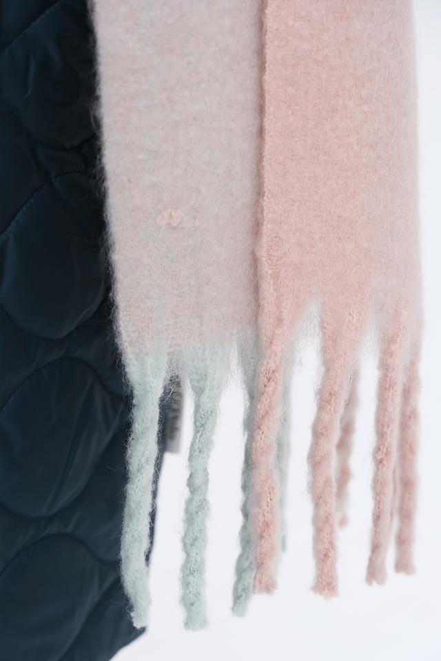 Шарф Fraas в полоску сочетает в себе нежные оттенки розового, голубого и бежевого. Аксессуар выполнен из мягкого полиэстера и дополнен бахромой по краям, что придает ему изысканный вид. Состав: полиэстер 100%