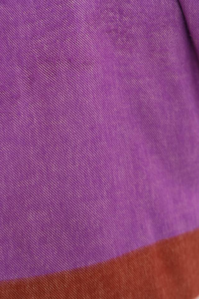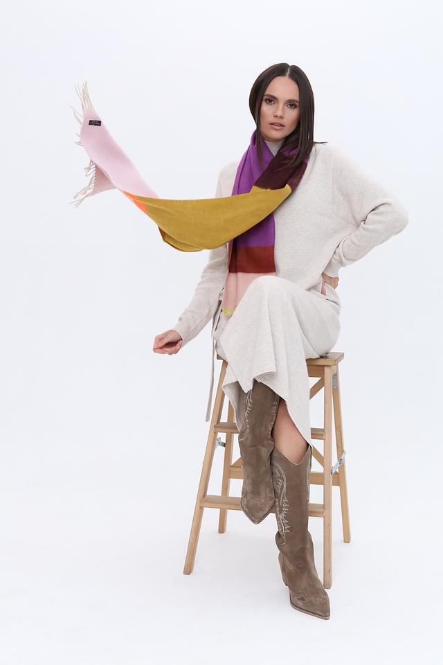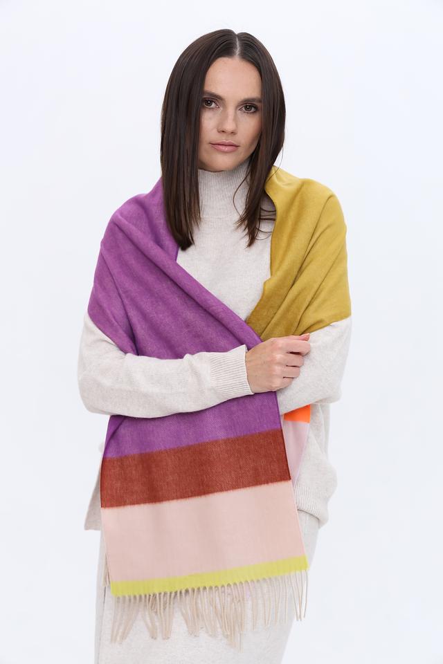 Шарф имеет яркий, многоцветный дизайн в полоску, сочетающий в себе оттенки фиолетового, горчичного, оранжевого, розового и лайма. Такая цветовая гамма позволит вам создать неповторимый образ и подчеркнуть свою индивидуальность.