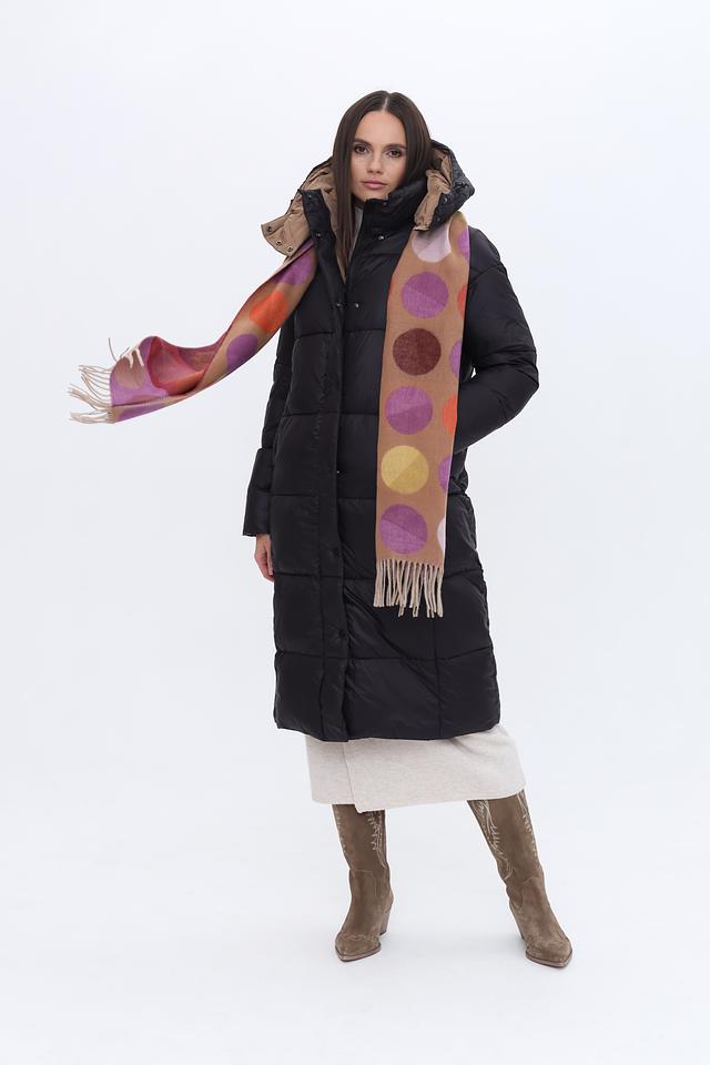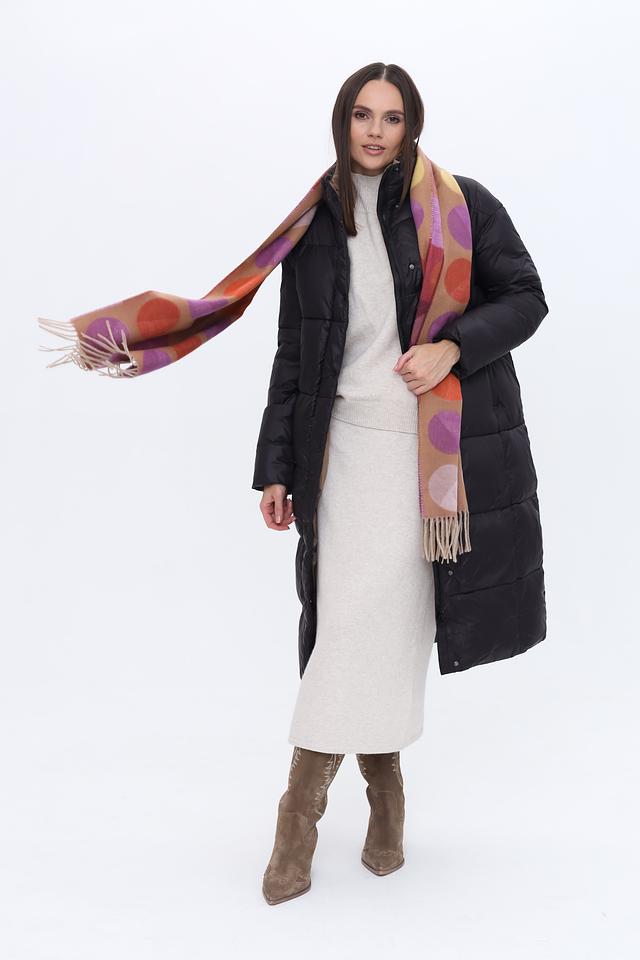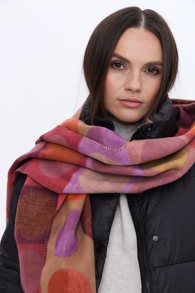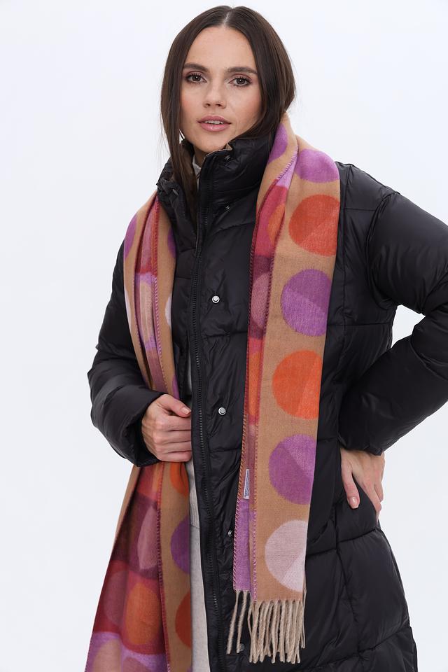 Дизайн шарфа представлен в виде геометрического принта, сочетающего в себе оранжевые, фиолетовые и коричневые оттенки. Круглые элементы разных размеров создают динамичный и современный образ.
