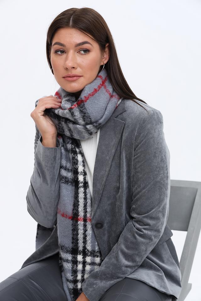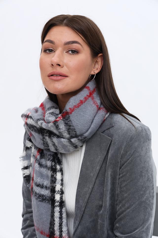 Этот шарф от бренда Fraas – идеальный аксессуар для создания уютного и стильного образа. Шарф выполнен в сером цвете и украшен классическим клетчатым принтом, который включает в себя сочетание серого, черного и красного цветов.