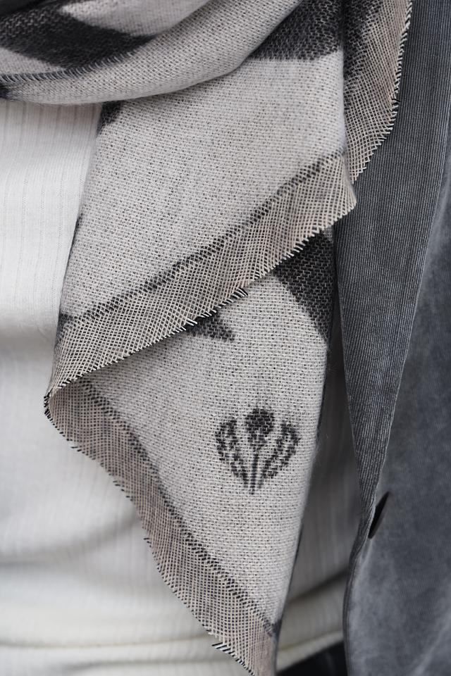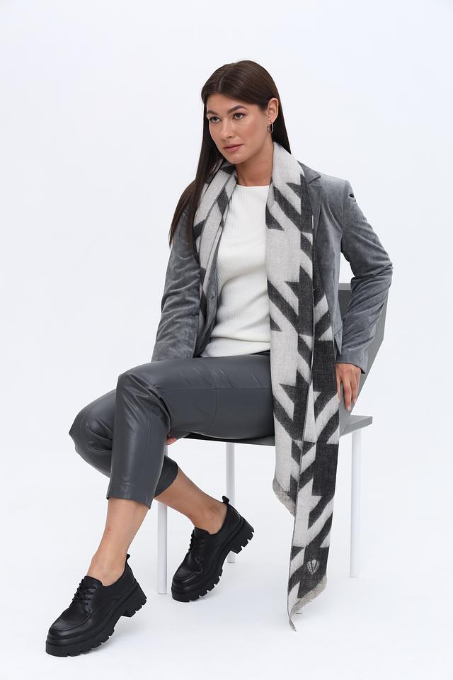 Шарф имеет прямоугольную форму и достаточно большой размер, позволяющий носить его разными способами – обернуть вокруг шеи, накинуть на плечи или использовать как палантин.