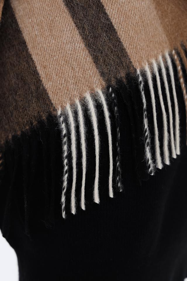 Изделие выполнено из высококачественного полиакрила (55%), полиамида (40%) и шерсти (5%). Такое сочетание материалов обеспечивает мягкость, тепло и долговечность. Отделка бахромой по краям придает пончо завершенный вид и добавляет ему изысканности.