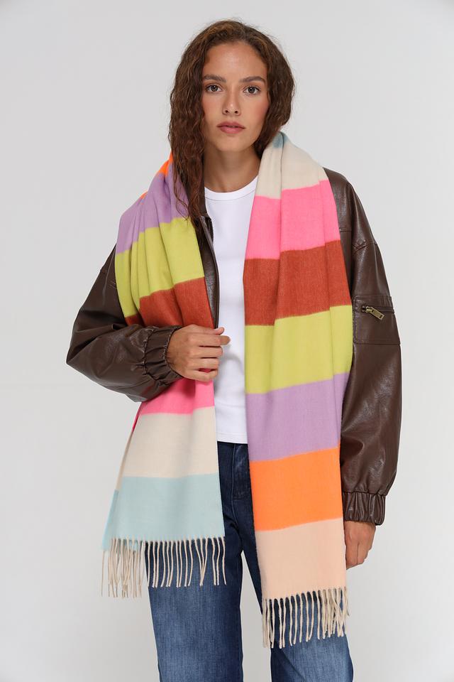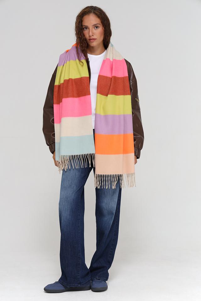 Этот шарф от Fraas станет ярким акцентом в вашем гардеробе. Он выполнен в широкую полоску, сочетающую в себе несколько цветов: розовый, коричневый, зелёный, оранжевый, лиловый и голубой.