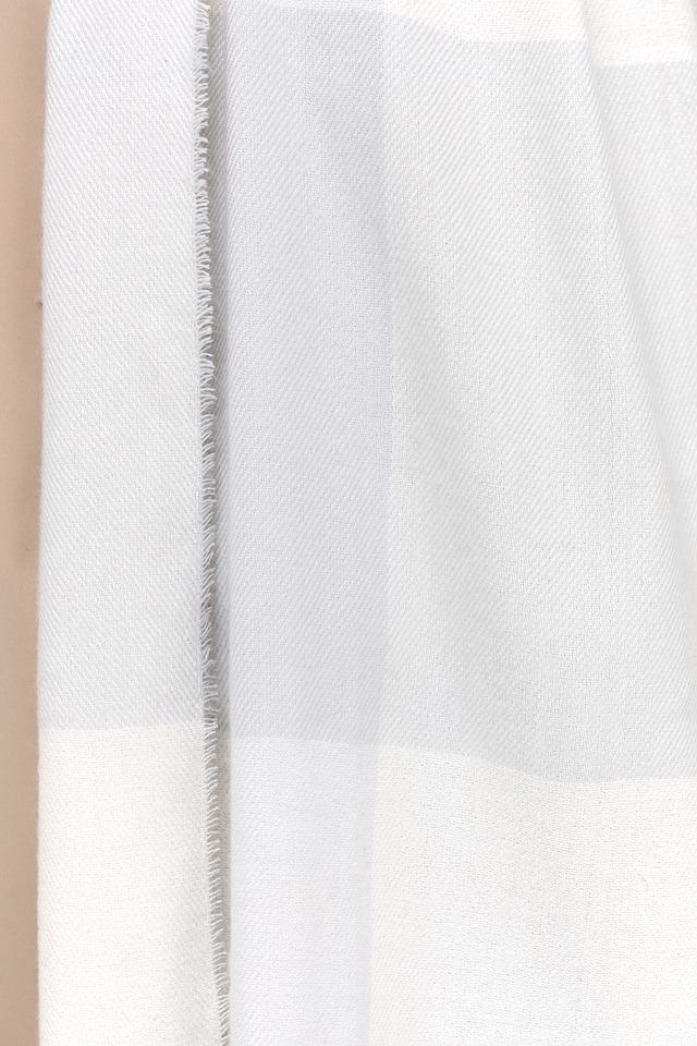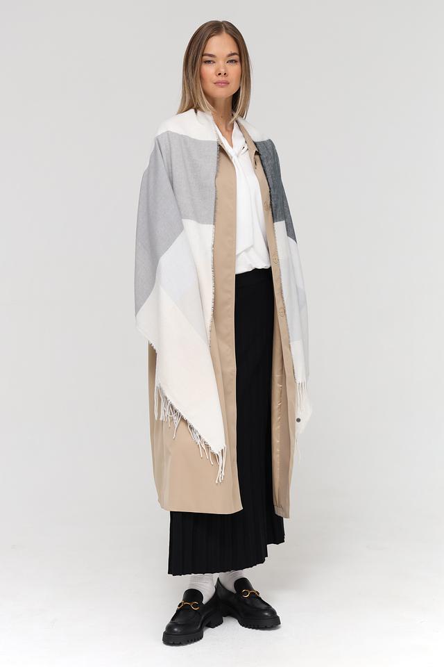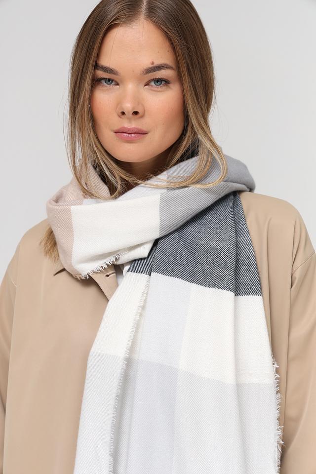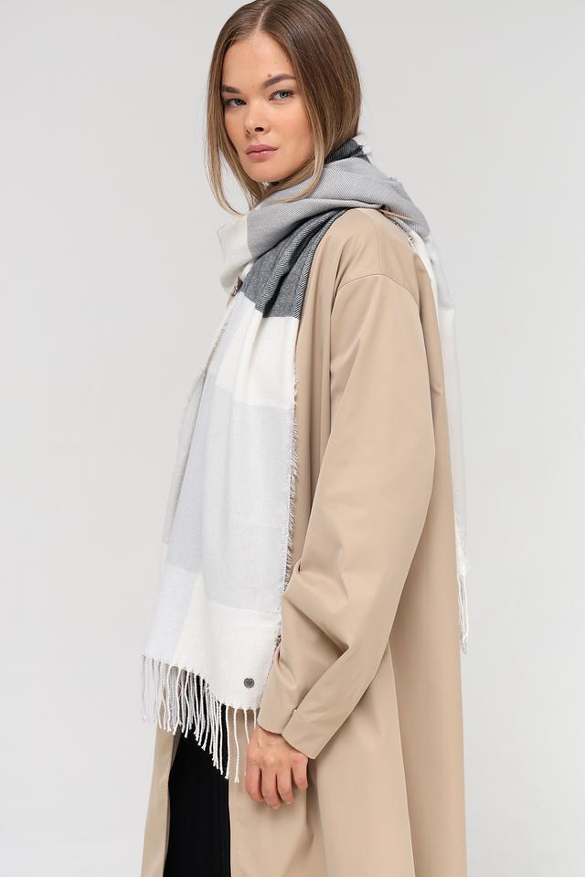 Дизайн шарфа представлен классической клеткой, сочетающей в себе оттенки белого, серого и синего. Такая цветовая гамма легко сочетается с различными элементами гардероба, позволяя создавать разнообразные образы.