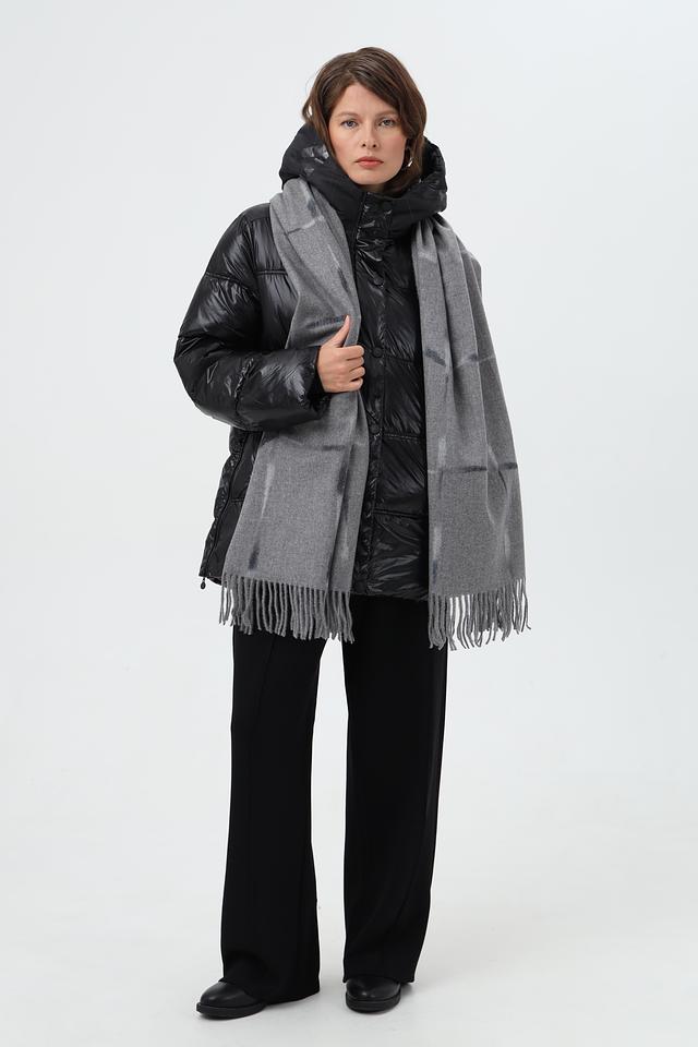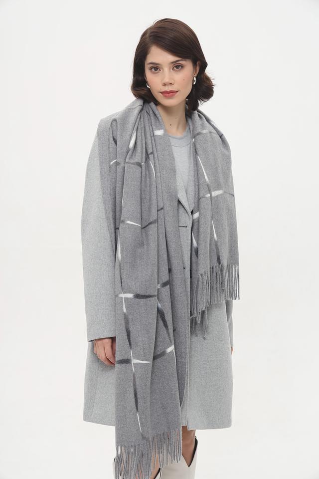 Дизайн шарфа украшен геометрическим принтом в виде светлых полос, расположенных в клетку. По всему периметру шарфа присутствует длинная бахрома, добавляющая ему изысканности и динамики.